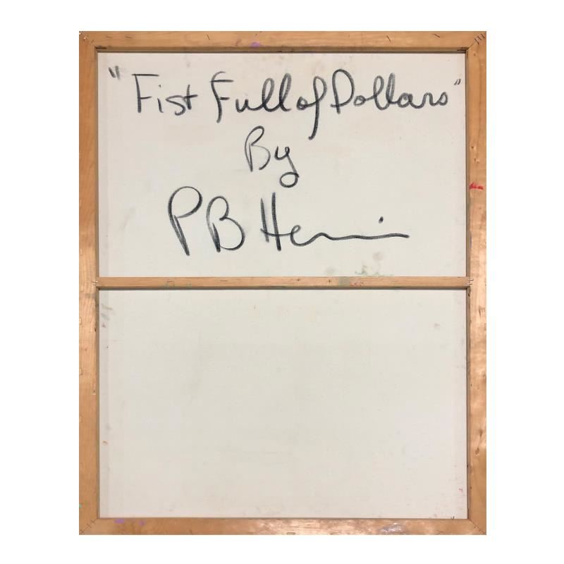 "Fist Full of Dollars" is an original oil painting on stretched canvas by Paul Blaine Henrie (1932-1999). The piece is hand signed by the artist and comes with a letter of authenticity. Please note that due to the age of this piece and the way it was stored, there are minor sings of wear, particularly on the corners and edges. Measures approximately. 40" x 30" (image).
