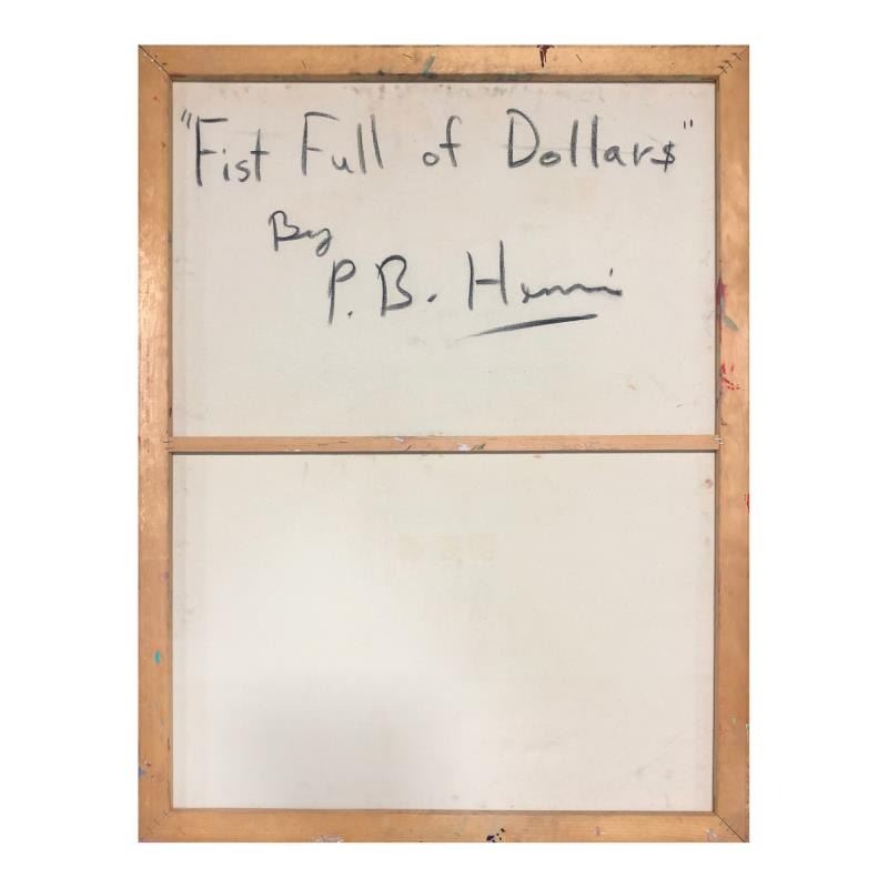 "Fist Full of Dollars" is an original oil painting on stretched canvas by Paul Blaine Henrie (1932-1999). The piece is hand signed by the artist and comes with a letter of authenticity. Please note that due to the age of this piece and the way it was stored, there are minor sings of wear, particularly on the corners and edges. Measures approximately. 40" x 30" (image).