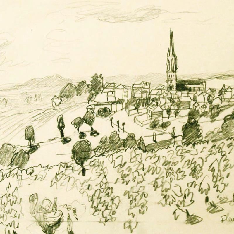 "Fleurie in Beaujolais, France" is an original Pencil on Paper by Wayne Ensrud. The piece is hand signed by the artist and comes with a Certificate of Authenticity. Measures approximately 15" x 18".