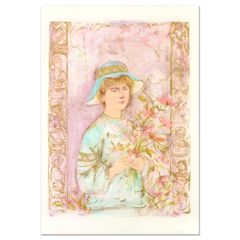 "Flora" is a limited edition lithograph on paper by Edna Hibel (1917-2014), numbered and hand signed by the artist. Includes Certificate of Authenticity. Measures approx. 25" x 35.5" (border), 22" x 30" (image).