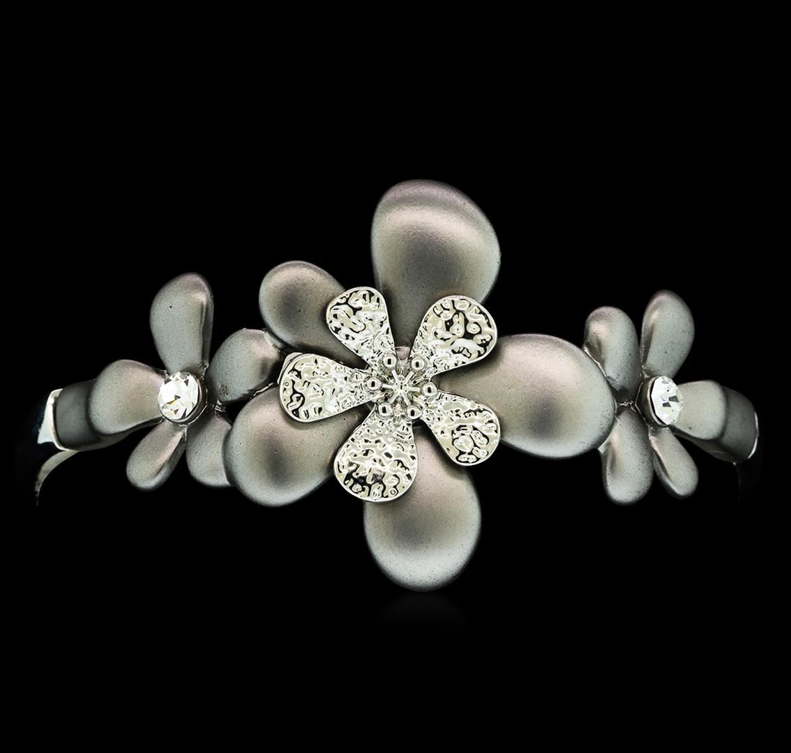 High end designer jewelry. Flower Hand Painted Bracelet - Rhodium Plated. Rhodium Plated Metal/ Crystal Detail. Grey/ Silver. Elastic. Total Weight: 23.8 grams.