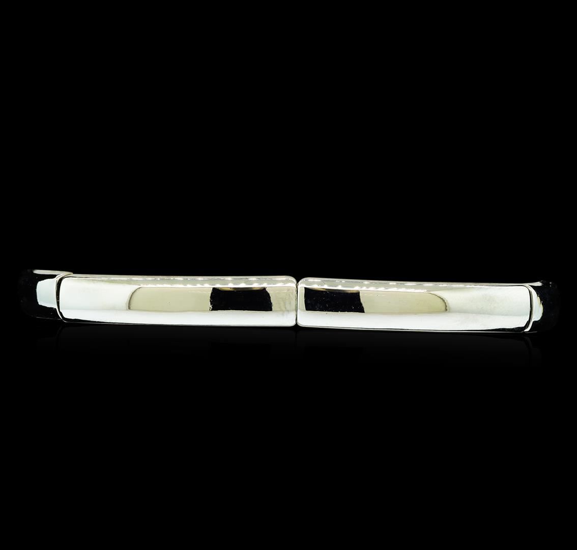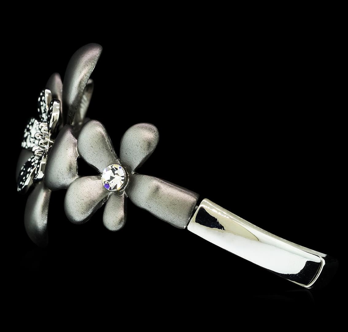 High end designer jewelry. Flower Hand Painted Bracelet - Rhodium Plated. Rhodium Plated Metal/ Crystal Detail. Grey/ Silver. Elastic. Total Weight: 23.8 grams.