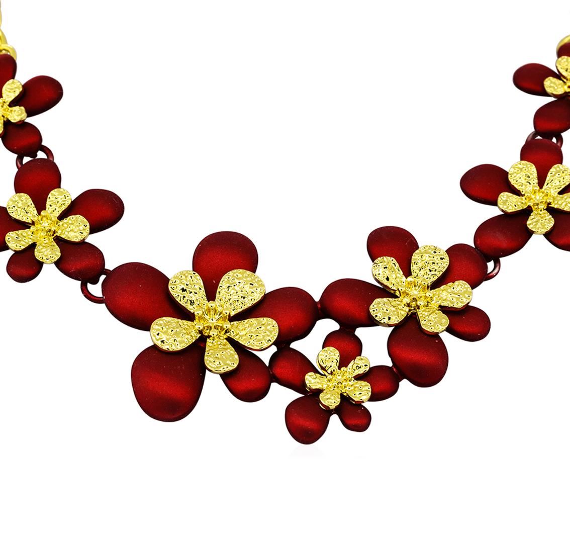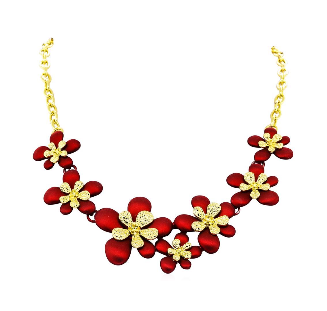 High end designer jewelry. Flower Hand Painted Necklace - Gold Plated. Gold Plated Chain/3" Ext Clasp. Ruby/ Gold. 16inches. Total Weight: 38.8 grams.