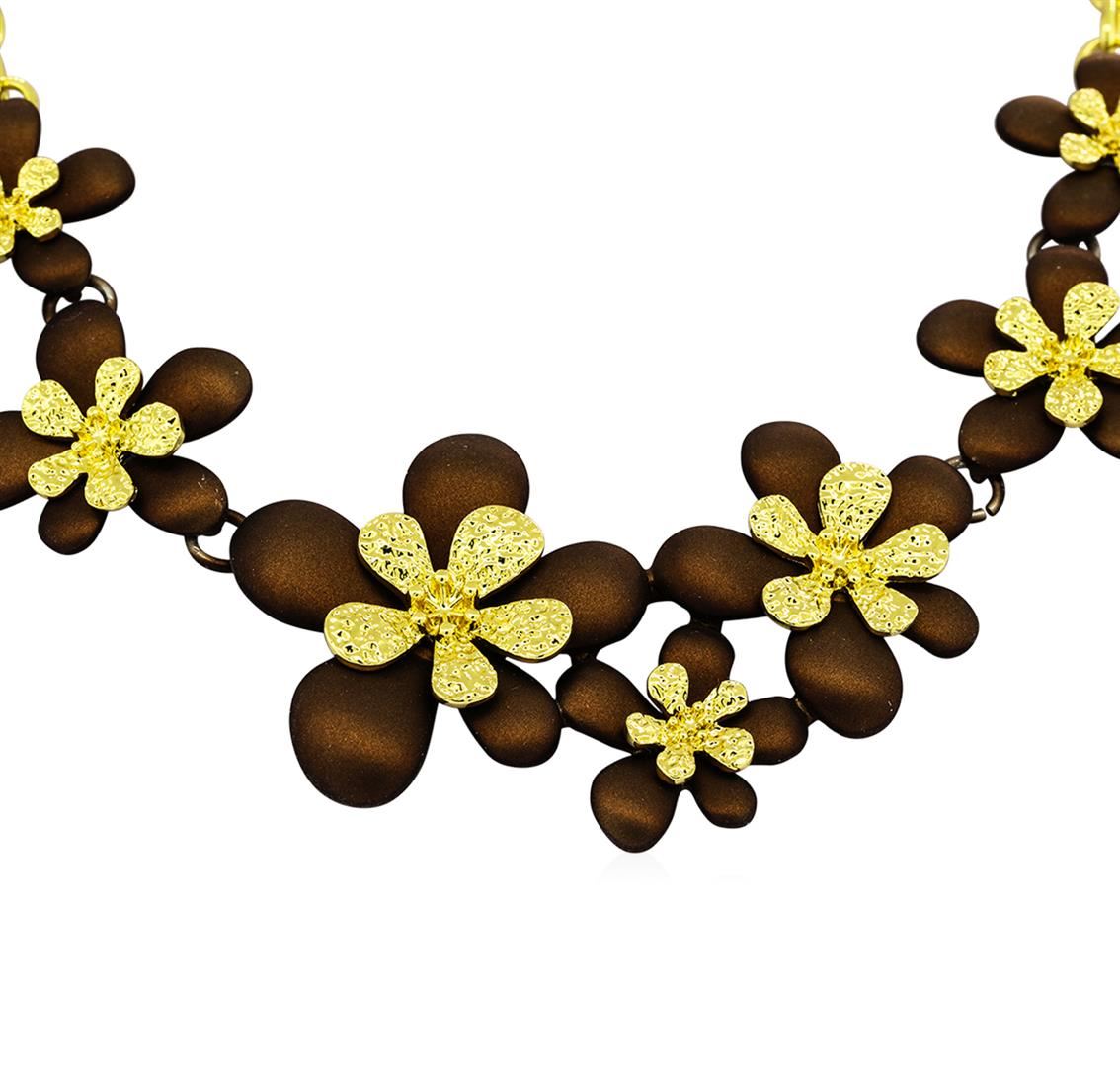 High end designer jewelry. Flower Hand Painted Necklace - Gold Plated. Gold Plated Chain/3" Ext Clasp. Bronze/ Gold. 16inches. Total Weight: 36.8 grams.