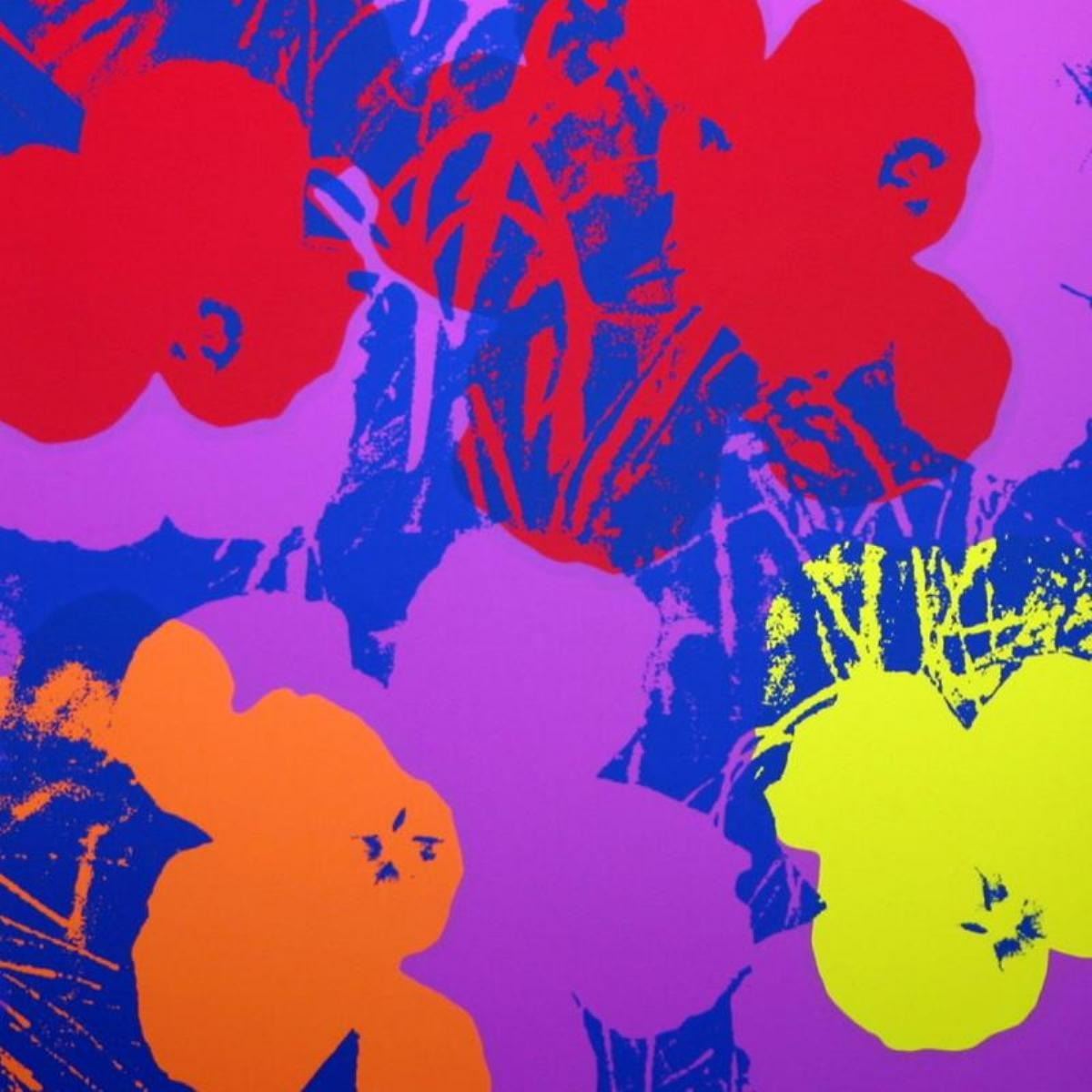 Flowers 11.66 by Warhol, Andy. "Flowers 11.66" is a silk screen print on paper (open edition) from Sunday B Morning featuring the works of Andy Warhol. The piece is stamped in blue on the back with "Published by Sunday B. Morning" and "fill in your own signature" and is accompanied by a certificate of authenticity. Measures approximately 36" x 36".
