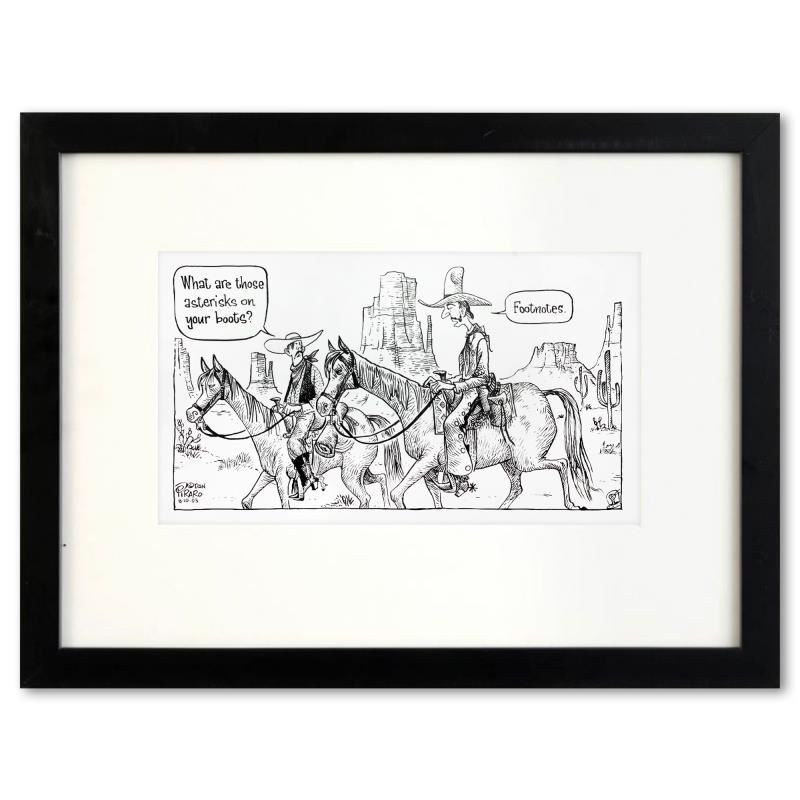 Footnotes By Bizarro Original. Enter a surreal and satirical world of twisted imagination and award winning creativity. "Footnotes" is an original pen & ink drawing on paper by Dan Piraro, creator of the critically acclaimed and award winning comic strip, Bizarro. This piece is hand signed, comes custom framed and includes a letter of authenticity. Measures approximately 14" x 21" (frame), 7" x 13" (image).This item requires special handling and may have a longer than usual turnaround.