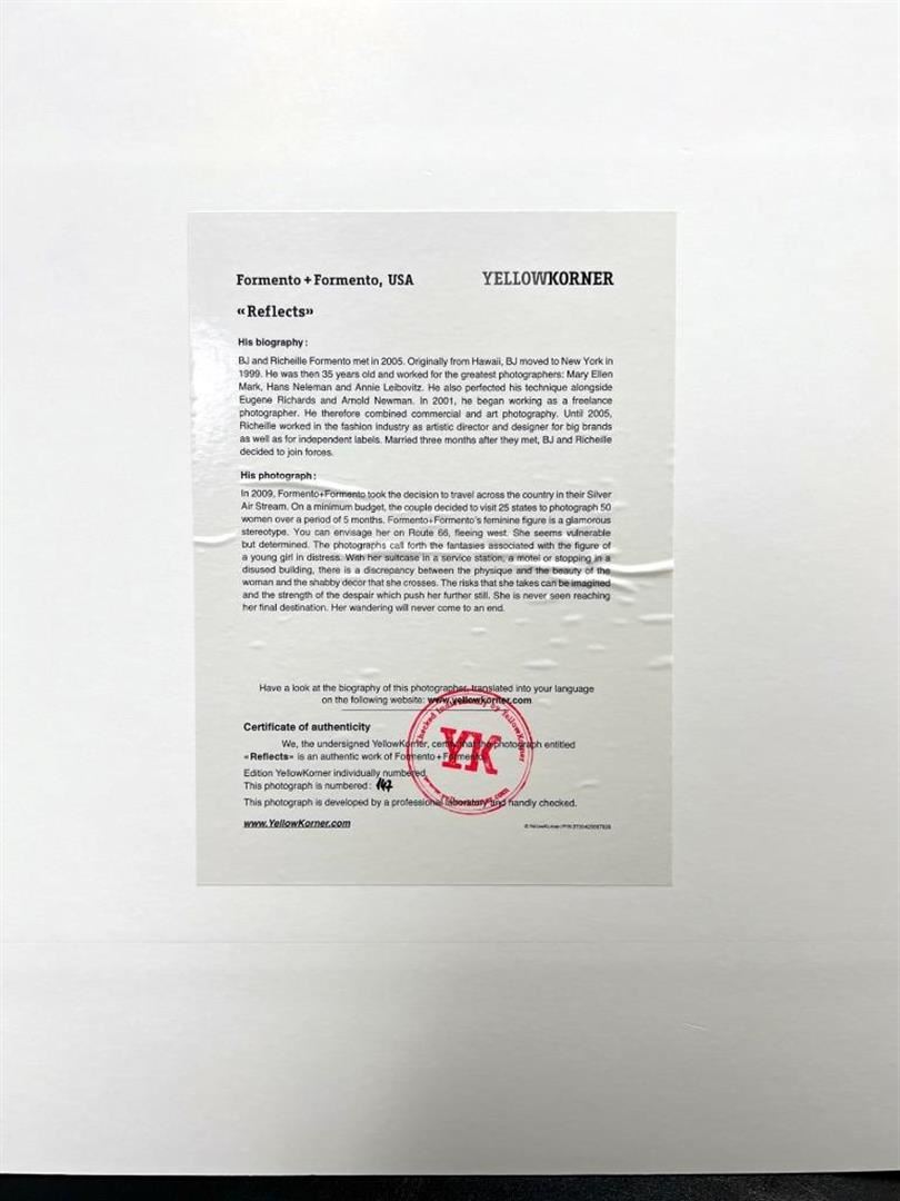 Formento + Formento USA Reflects YellowKorner Certified Photograph. Certificate of Authenticity from YellowKorner affixed to the back. Matted Dimensions 16"x20". Protected with Clear Mylar Sleeve.