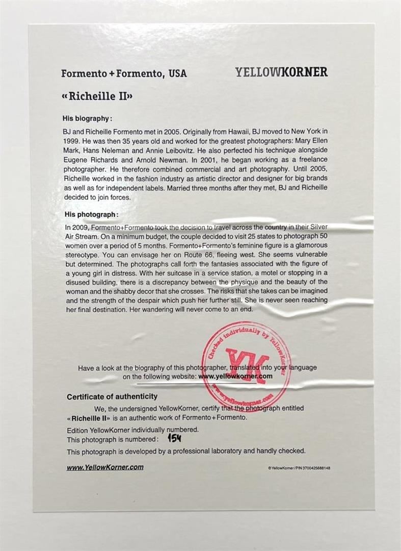 Formento + Formento Richeille II Female Traveler YellowKorner Certified Photograph. Certificate of Authenticity from YellowKorner affixed to the back. Matted Dimensions 16"x20". Protected with Clear Mylar Sleeve.