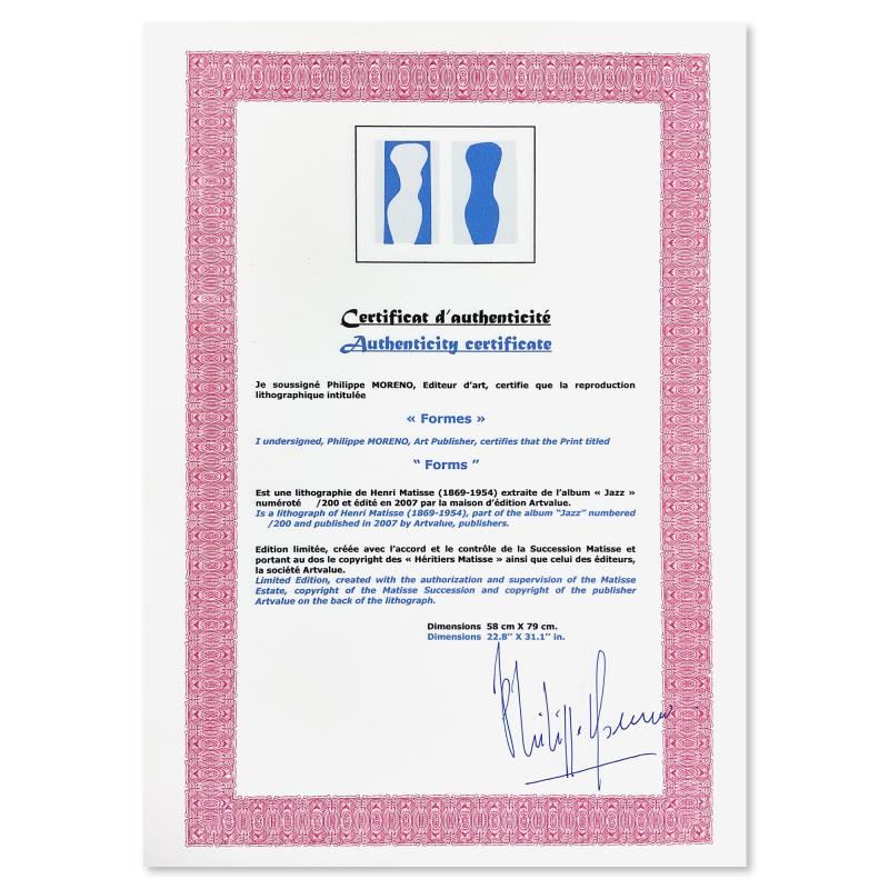 "Formes (Forms)" is a limited edition lithograph by Henri Matisse (1869-1954). This piece comes from an edition of 200 authorized by the Matisse Estate; the edition number is not on the piece itself but on the certificate. This piece comes custom framed. Includes Certificate of Authenticity. Measures approx. 37" x 29" (frame), 31" x 23" (image).