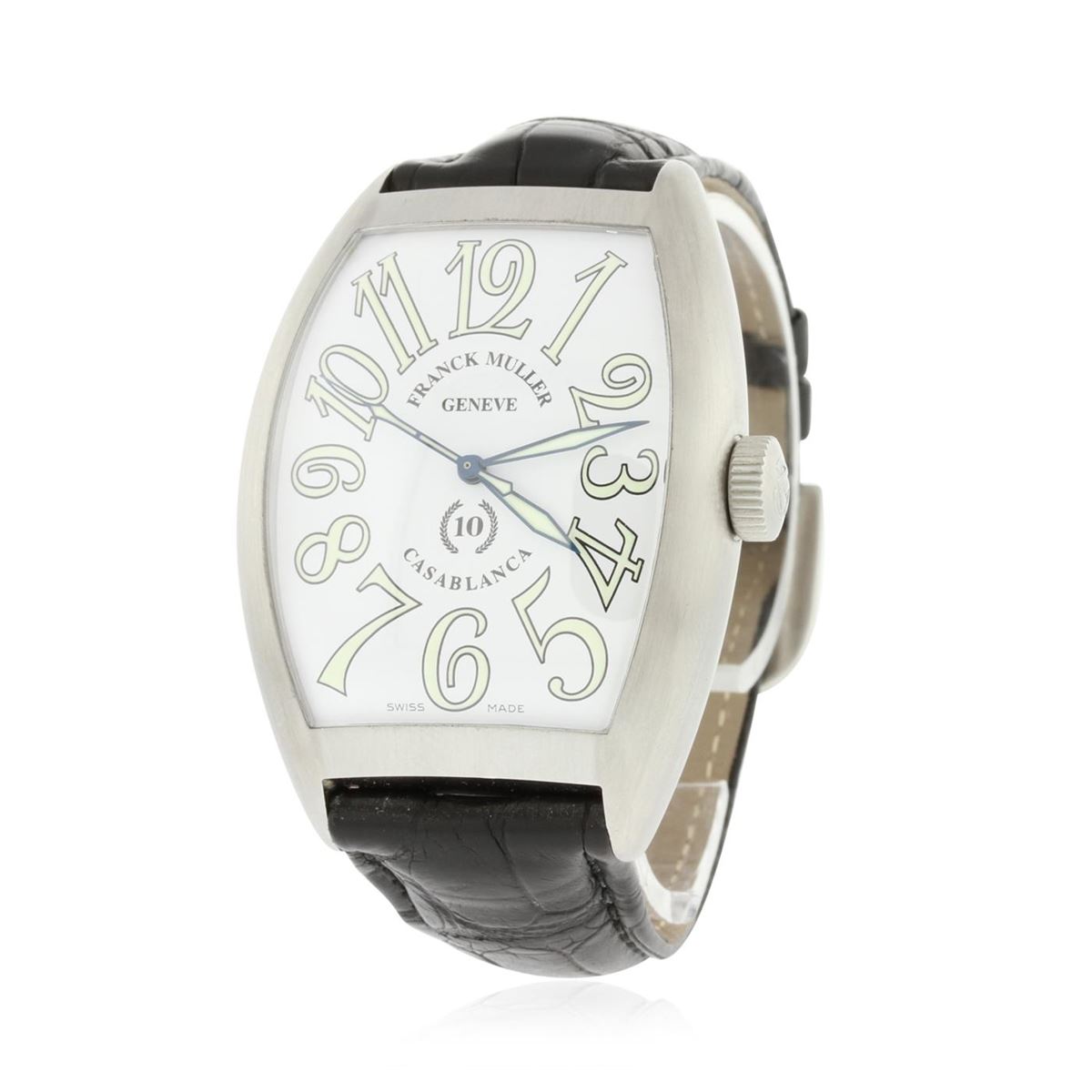 One Franck Muller Casablanca 10th Anniversary Limited Edition Stainless Steel Wristwatch featuring: 39.0 x 47.0mm stainless steel case and bezel, Original Franck Muller Black Leather Strap, Push-In Crown, White Dial, Luminescent Tone Hand Indicators and Hour Markers, Scratch Resistant Sapphire Crystal, Franck Muller Caliber 2800 Automatic Movement, Hour/Minute/Second function, 17.5mm Lug Width, Franck Muller Tang Buckle Clasp. Water resistant up to 30M / 100 Feet.