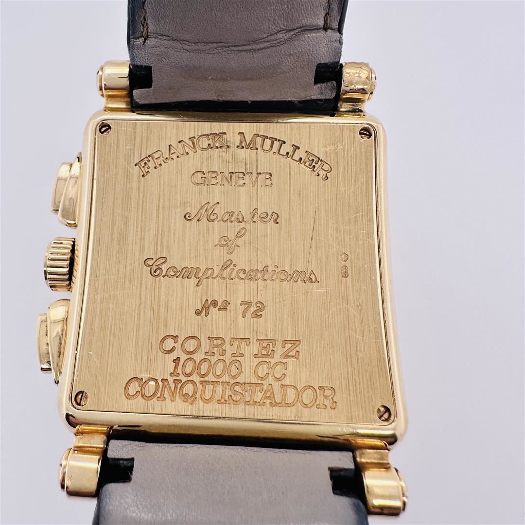 One Franck Muller Conquistador Cortez Chronograph RG Black Lacquered Dial 10000 CC. Franck Muller 10000 CC Conquistador Cortez Chronograph "Master of Complications" 18kt Yellow Gold, Black Lacquered Dial with Luminescent Arabic Hour Markers. Features skeletonized baton luminous hands with luminous, and there is a center sweep seconds hand with a luminous red arrow pointer. A circular date aperture window is at the 6 o'clock position. Self-Winding Chronograph Automatic Movement. Fitted on a Black Alligator Leather Strap with 18kt Gold Tongue Buckle, 54mm x 41.1mm Franck Muller is world-famous for its Grand Complications and Luxury watches are exceptionally recognizable. Franck Muller watches are one of the finest and most complicated in the world. The manufacture was founded in Geneva by Franck Muller and Vartan Sirmakes with the aim of creating exclusive timepieces characterized by complicated movements and original designs. Thanks to its strong in-house capabilities in numerous fields of Haute Horlogerie, this company rapidly became one of the best Swiss Horlogerie brands. The company's distinctive design characteristics include atypically shaped cases, Art Deco inspired dials, spade hands, and unique Arabic or Roman numerals. In recent years, Franck Muller has become well-known for the tonneau or barrel-shaped case. A trained master watchmaker from the Swiss town of La Chaux-de-Fonds, Franck Muller has always sought to produce timepieces unlike any other. In doing so, he has managed to bring a breath of fresh air into the watch industry while also honoring the traditions of "haute horlogerie."