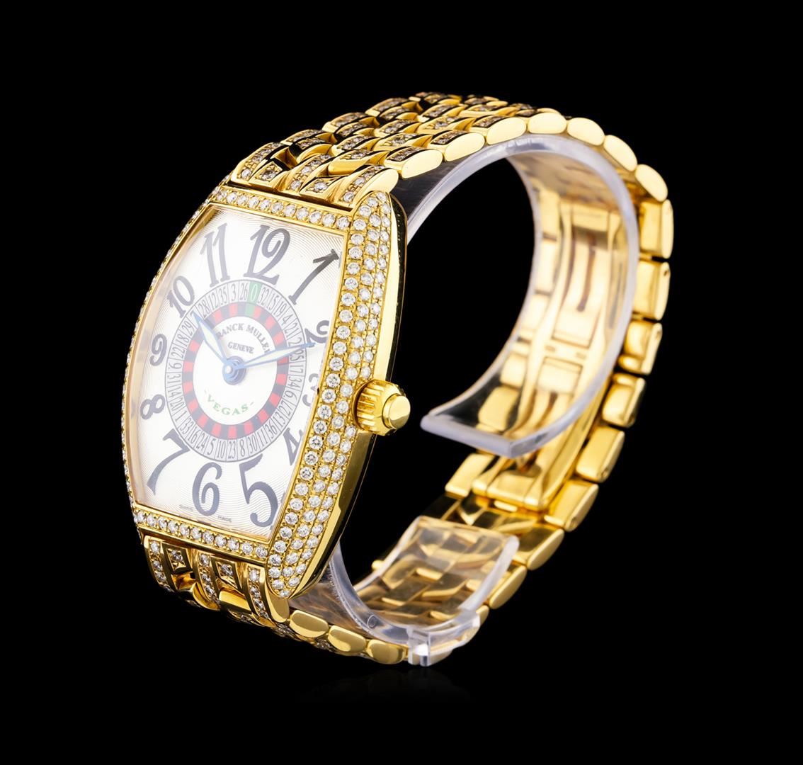 One Franck Muller Vegas watch featuring: Case: 47mm x 34mm 18KT yellow gold. Dial: Silver with roulette wheel, Arabic numerals. Bezel: 18KT yellow gold set with diamonds. Bracelet: 18KT yellow gold set with diamonds, gold deployment buckle. Movement: Automatic. Crystal: Sapphire. Condition: Very minor wear on crystal, case and bracelet, roulette wheel is functional, overall very good condition.