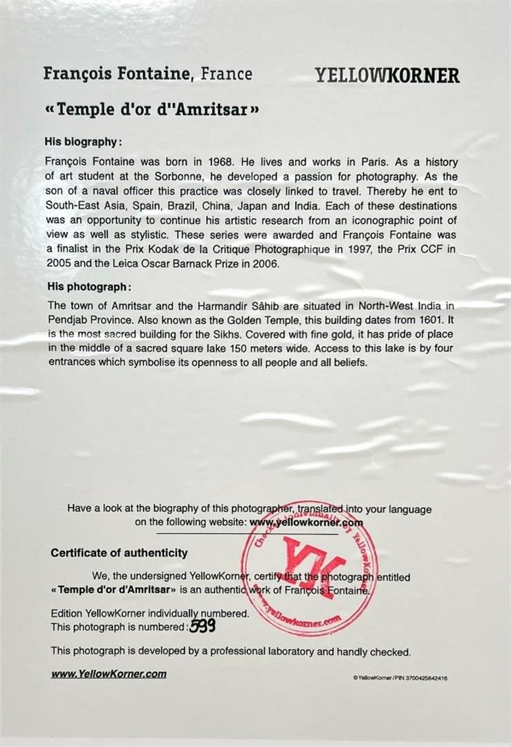 Francois Fontaine France temple Dor D.Amritsar YellowKorner Certified Photograph. Certificate of Authenticity from YellowKorner affixed to the back. Matted Dimensions 16"x20". Protected with Clear Mylar Sleeve.