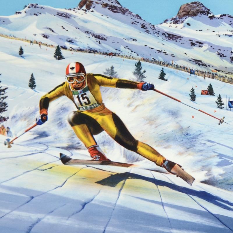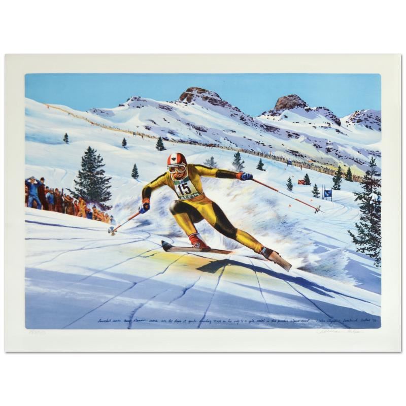 "Franz Klammer (1976)" is a limited edition lithograph on paper by William Nelson, numbered and hand signed by the artist! Measures approx. 29" x 22" (with border); 26" x 19" (image).
