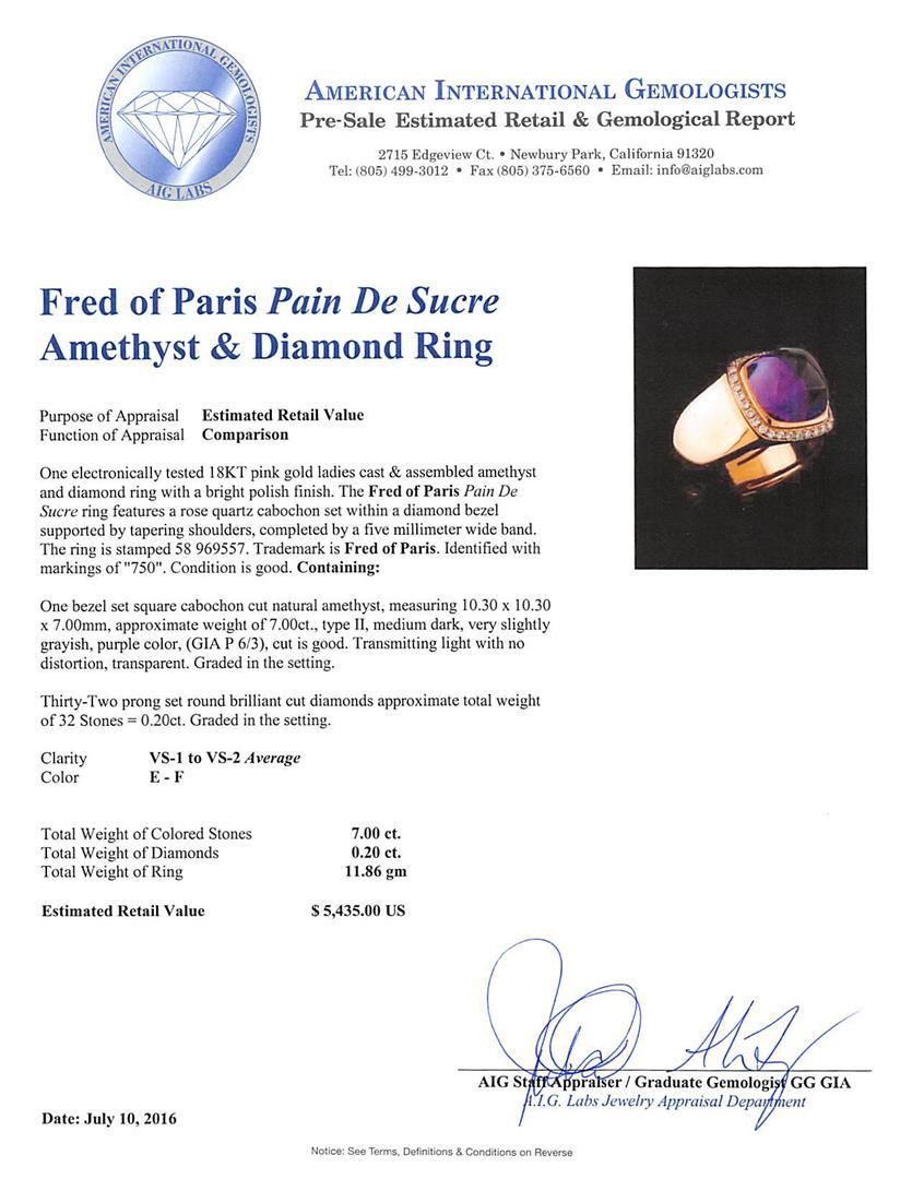 One electronically tested 18KT pink gold ladies cast & assembled amethyst and diamond ring with a bright polish finish. The Fred of Paris "Pain De Sucre" ring features a rose quartz cabochon set within a diamond bezel supported by tapering shoulders, completed by a five millimeter wide band. The ring is stamped 58 969557. Trademark is Fred of Paris. Identified with markings of "750". Condition is good. Containing: One bezel set square cabochon cut natural amethyst, measuring 10.30 x 10.30 x 7.00mm, approximate weight of 7.00ct., type II, medium dark, very slightly grayish, purple color, (GIA P 6/3), cut is good. Transmitting light with no distortion, transparent. Graded in the setting. Thirty-Two prong set round brilliant cut diamonds approximate total weight of 32 Stones = 0.20ct. Graded in the setting. Clarity VS-1 to VS-2. Color: E - F. Total Weight of Colored Stones 7.00ct.. Total Weight of Diamonds 0.20ct.. Total Weight of Ring 11.86gm. AIG Appraised at $5,435.00.