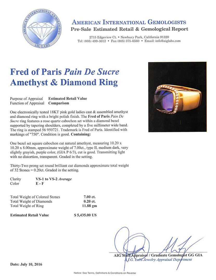 One electronically tested 18KT pink gold ladies cast & assembled amethyst and diamond ring with a bright polish finish. The Fred of Paris "Pain De Sucre" ring features a rose quartz cabochon set within a diamond bezel supported by tapering shoulders, completed by a five millimeter wide band. The ring is stamped 56 950721. Trademark is Fred of Paris. Identified with markings of "750". Condition is good. Containing: One bezel set square cabochon cut natural amethyst, measuring 10.20 x 10.20 x 8.00mm, approximate weight of 7.00ct., type II, medium dark, very slightly grayish, purple color, (GIA P 6/3), cut is good. Transmitting light with no distortion, transparent. Graded in the setting. Thirty-Two prong set round brilliant cut diamonds approximate total weight of 32 Stones = 0.20ct. Graded in the setting. Clarity VS-1 to VS-2. Color: E - F. Total Weight of Colored Stones 7.00ct.. Total Weight of Diamonds 0.20ct.. Total Weight of Ring 11.88gm. AIG Appraised at $5,435.00.