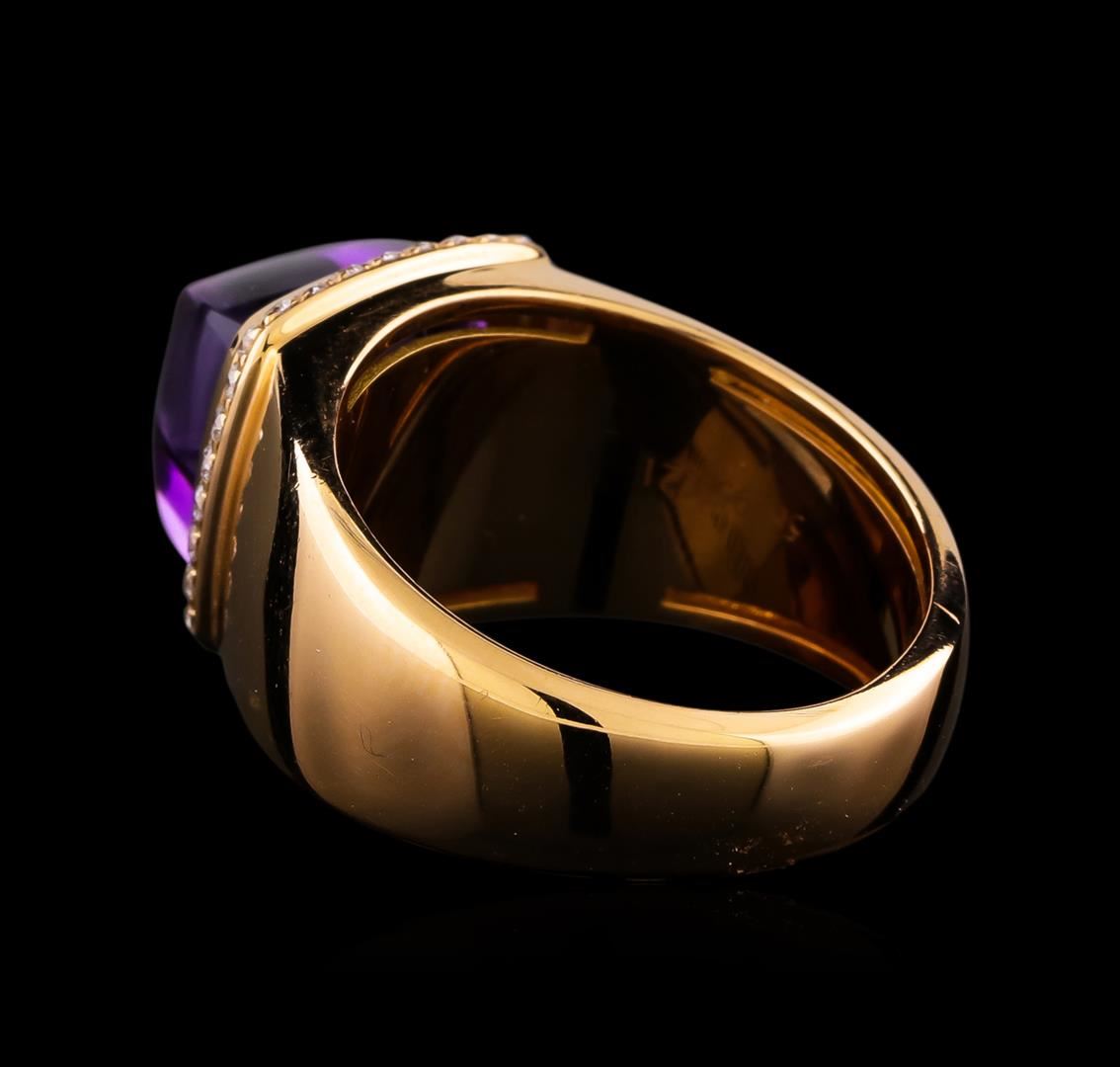 One electronically tested 18KT pink gold ladies cast & assembled amethyst and diamond ring with a bright polish finish. The Fred of Paris "Pain De Sucre" ring features a rose quartz cabochon set within a diamond bezel supported by tapering shoulders, completed by a five millimeter wide band. The ring is stamped 56 950721. Trademark is Fred of Paris. Identified with markings of "750". Condition is good. Containing: One bezel set square cabochon cut natural amethyst, measuring 10.20 x 10.20 x 8.00mm, approximate weight of 7.00ct., type II, medium dark, very slightly grayish, purple color, (GIA P 6/3), cut is good. Transmitting light with no distortion, transparent. Graded in the setting. Thirty-Two prong set round brilliant cut diamonds approximate total weight of 32 Stones = 0.20ct. Graded in the setting. Clarity VS-1 to VS-2. Color: E - F. Total Weight of Colored Stones 7.00ct.. Total Weight of Diamonds 0.20ct.. Total Weight of Ring 11.88gm. AIG Appraised at $5,435.00.