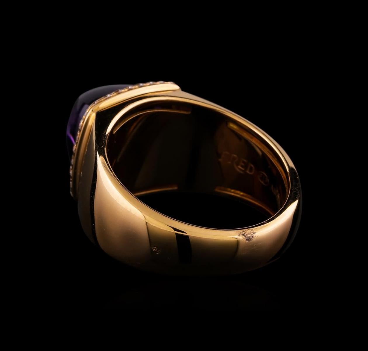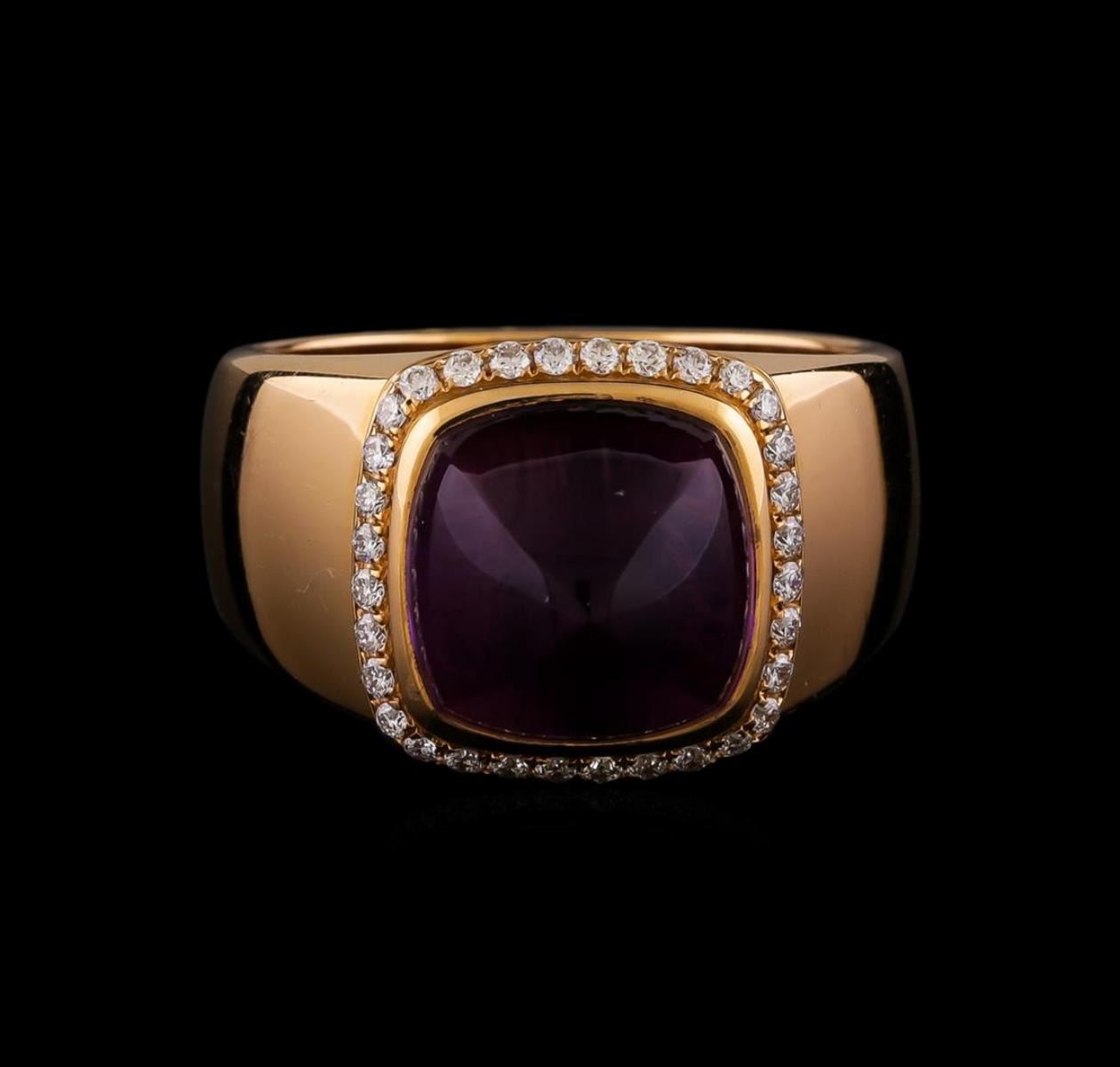 One electronically tested 18KT pink gold ladies cast & assembled amethyst and diamond ring with a bright polish finish. The Fred of Paris "Pain De Sucre" ring features a rose quartz cabochon set within a diamond bezel supported by tapering shoulders, completed by a five millimeter wide band. The ring is stamped 58 969557. Trademark is Fred of Paris. Identified with markings of "750". Condition is good. Containing: One bezel set square cabochon cut natural amethyst, measuring 10.30 x 10.30 x 7.00mm, approximate weight of 7.00ct., type II, medium dark, very slightly grayish, purple color, (GIA P 6/3), cut is good. Transmitting light with no distortion, transparent. Graded in the setting. Thirty-Two prong set round brilliant cut diamonds approximate total weight of 32 Stones = 0.20ct. Graded in the setting. Clarity VS-1 to VS-2. Color: E - F. Total Weight of Colored Stones 7.00ct.. Total Weight of Diamonds 0.20ct.. Total Weight of Ring 11.86gm. AIG Appraised.