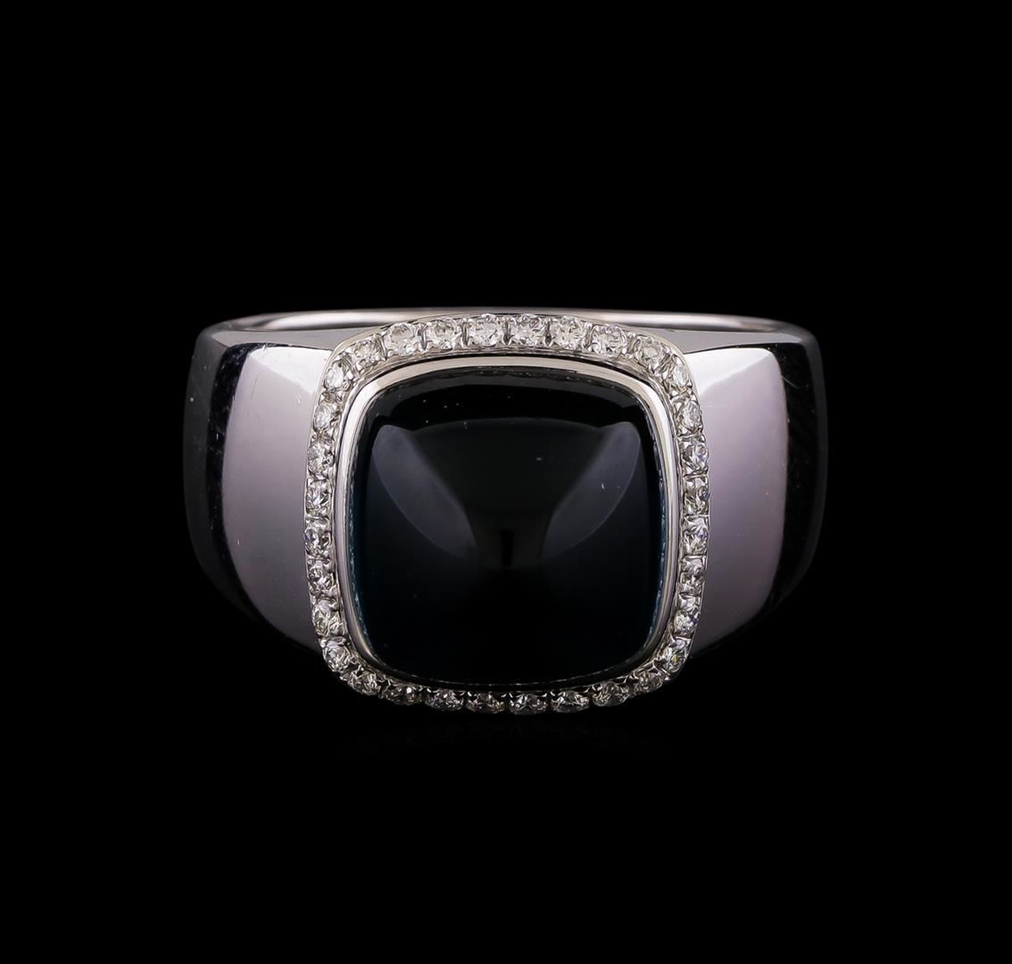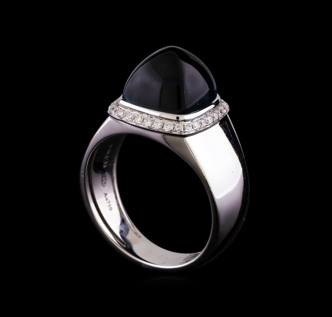 One electronically tested 18KT white gold cast & assembled blue topaz and diamond ring with a bright polish finish. The Fred of Paris "Pain De Sucre" ring features a blue topaz cabochon set within a diamond bezel supported by tapering shoulders, completed by a five millimeter wide band. The ring is stamped 58 986140. Trademark is Fred of Paris. Identified with markings of "750". Condition is good. Containing: One bezel set square cabochon cut natural blue topaz, measuring 10.60 x 10.60 x 8.00mm, approximate weight of 9.30ct., type I, dark, very slightly grayish, very slightly greenish blue color, (GIA vslgB 7/3), cut is good. Transmitting light with no distortion, transparent. Graded in the setting. A deposit of a thin layer has been applied to the topaz to produce the intense color effect. The process utilizes a very high temperature treatment, diffusion of ions into the topaz, plus in some cases neutron bombardment has been used to create the color center. Diffusion processes causes the added ions to become part of the crystal surface with no distinct boundary. Do not put a gem treated in this manner into an ultrasonic cleaner. Thirty-Two prong set round brilliant cut diamonds approximate total weight of 32 Stones = 0.20ct. Graded in the setting. Clarity VS-1 to VS-2. Color: E - F. Total Weight of Colored Stones 9.30ct.. Total Weight of Diamonds 0.20ct.. Total Weight of Ring 12.86gm. AIG Appraised at $5,770.00.