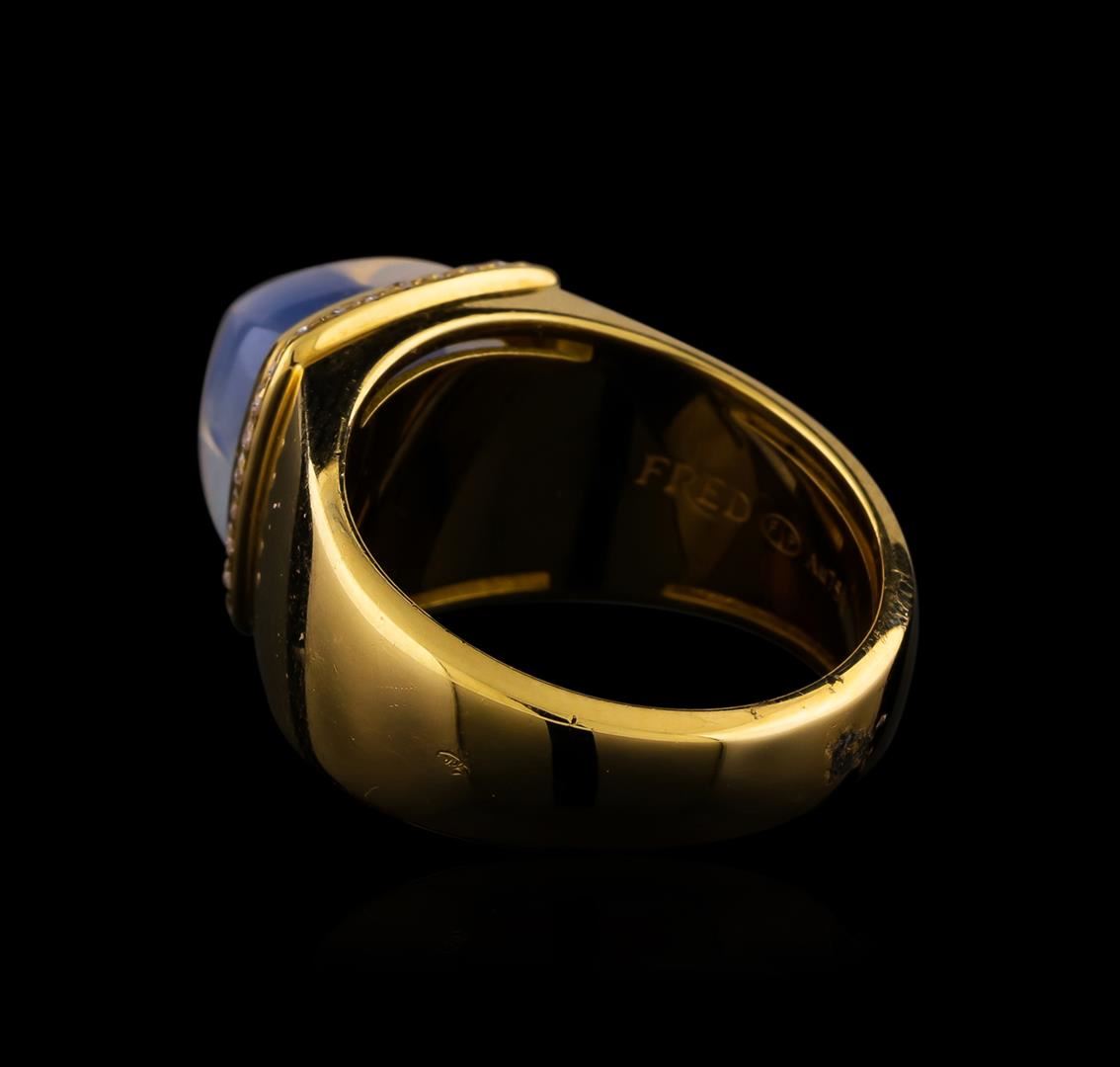 One electronically tested 18KT yellow gold cast & assembled white chalcedony and diamond ring with a bright polish finish. The Fred of Paris "Pain De Sucre" ring features a white chalcedony cabochon set within a diamond bezel supported by tapering shoulders, completed by a five millimeter wide band. The ring is stamped 55 950563. Trademark is Fred of Paris. Identified with markings of "750". Condition is good. Containing: One bezel set square cabochon cut natural , measuring 10.60 x 10.50 x 7.00mm, approximate weight of 6.80ct., colorless, very slightly grayish, white color, (GIA W 0/3), cut is good. Transmitting light somewhat diffusely, transparent to translucent. Naturally occurring internal & external characteristics are present. Graded in the setting. Thirty-Two prong set round brilliant cut diamonds approximate total weight of 32 Stones = 0.20ct. Graded in the setting. Clarity VS-1 to VS-2. Color: E - F. Total Weight of Colored Stones 6.80ct.. Total Weight of Diamonds 0.20ct.. Total Weight of Ring 11.54gm. AIG Appraised at $4,990.00.