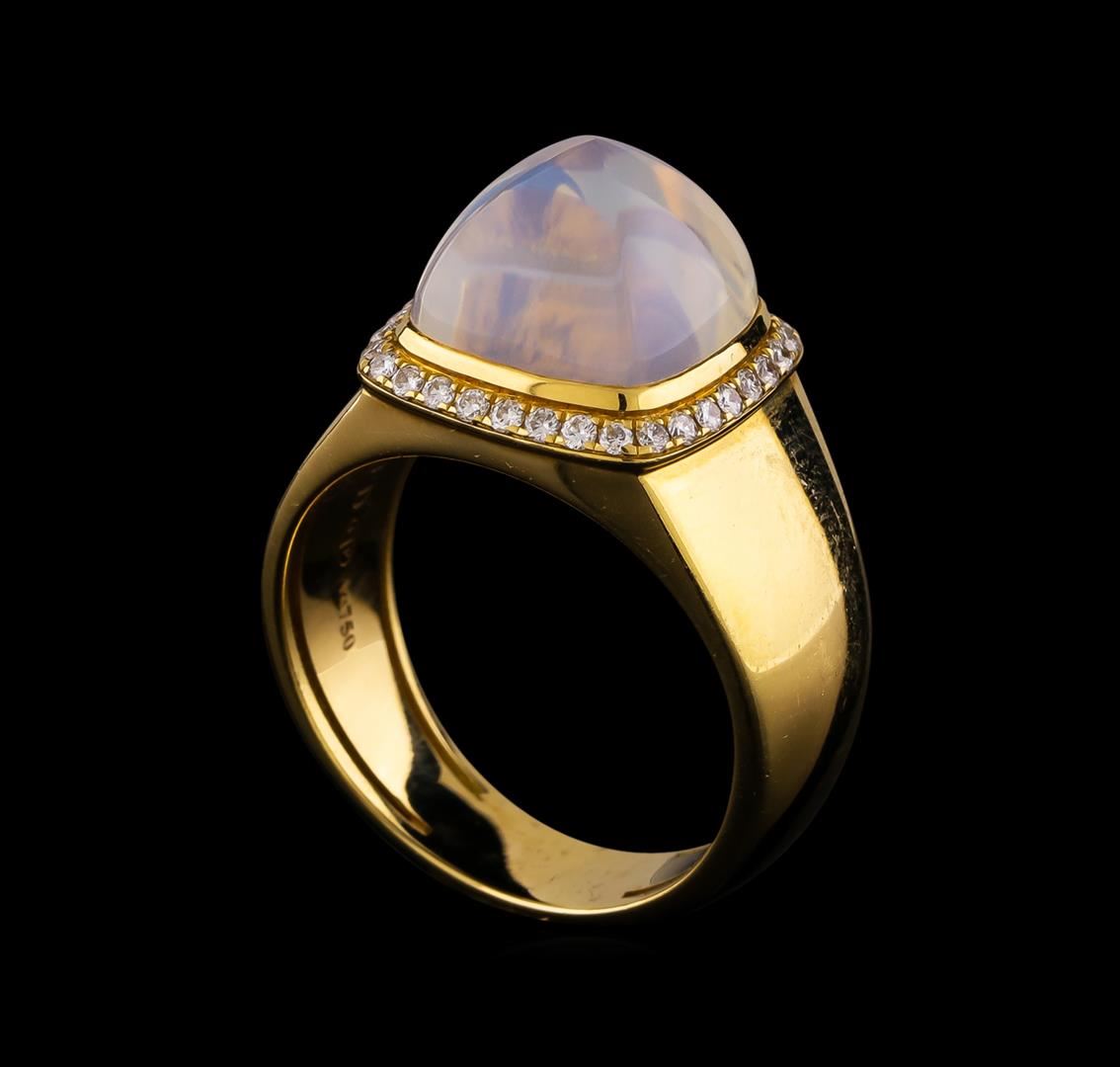 One electronically tested 18KT yellow gold cast & assembled white chalcedony and diamond ring with a bright polish finish. The Fred of Paris "Pain De Sucre" ring features a white chalcedony cabochon set within a diamond bezel supported by tapering shoulders, completed by a five millimeter wide band. The ring is stamped 55 950563. Trademark is Fred of Paris. Identified with markings of "750". Condition is good. Containing: One bezel set square cabochon cut natural , measuring 10.60 x 10.50 x 7.00mm, approximate weight of 6.80ct., colorless, very slightly grayish, white color, (GIA W 0/3), cut is good. Transmitting light somewhat diffusely, transparent to translucent. Naturally occurring internal & external characteristics are present. Graded in the setting. Thirty-Two prong set round brilliant cut diamonds approximate total weight of 32 Stones = 0.20ct. Graded in the setting. Clarity VS-1 to VS-2. Color: E - F. Total Weight of Colored Stones 6.80ct.. Total Weight of Diamonds 0.20ct.. Total Weight of Ring 11.54gm. AIG Appraised at $4,990.00.