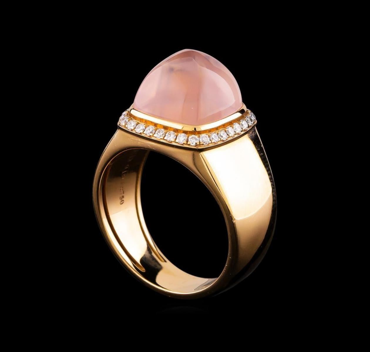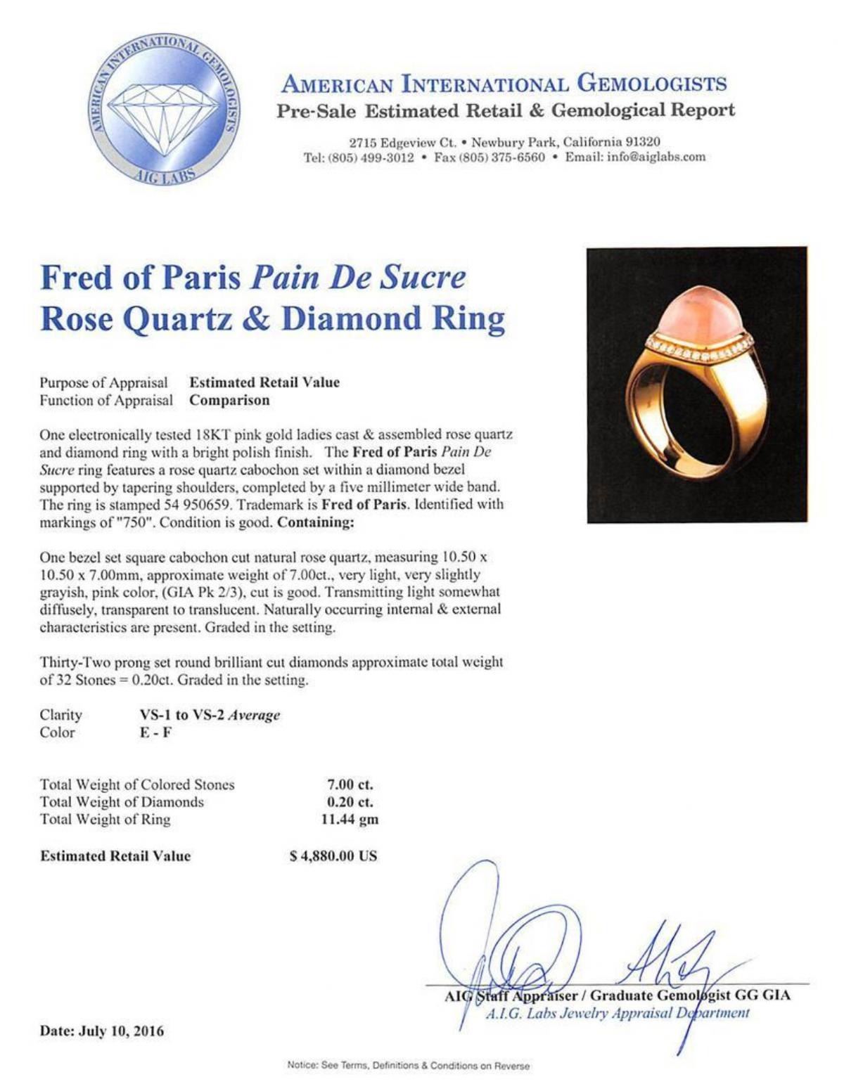One electronically tested 18KT pink gold ladies cast & assembled rose quartz and diamond ring with a bright polish finish. The Fred of Paris "Pain De Sucre" ring features a rose quartz cabochon set within a diamond bezel supported by tapering shoulders, completed by a five millimeter wide band. The ring is stamped 54 950659. Trademark is Fred of Paris. Identified with markings of "750". Condition is good. Containing: One bezel set square cabochon cut natural rose quartz, measuring 10.50 x 10.50 x 7.00mm, approximate weight of 7.00ct., very light, very slightly grayish, pink color, (GIA Pk 2/3), cut is good. Transmitting light somewhat diffusely, transparent to translucent. Naturally occurring internal & external characteristics are present. Graded in the setting. Thirty-Two prong set round brilliant cut diamonds approximate total weight of 32 Stones = 0.20ct. Graded in the setting. Clarity VS-1 to VS-2. Color: E - F. Total Weight of Colored Stones 7.00ct.. Total Weight of Diamonds 0.20ct.. Total Weight of Ring 11.44gm. AIG Appraised.