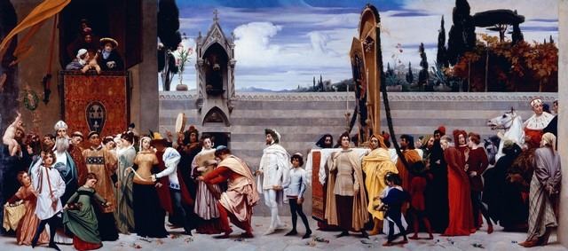 Artist: Frederic Leighton - Title: Celebration of Madonna in Florence - Medium: Fine Art Reproduction Giclee on Canvas - Image Size: Approximately 14 inches x 32 inches - Unframed on Unstretched Canvas - Biography: Frederic Leighton, 1st Baron Leighton, PRA (3 December 1830 - 25 January 1896), known as Sir Frederic Leighton between 1878 and 1896, was a British painter, draughtsman and sculptor. His works depicted historical, biblical, and classical subject matter in an academic style. His paintings were enormously popular, and expensive, during his lifetime, but fell out of critical favour for many decades in the early 20th century.