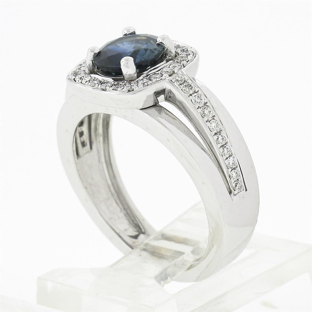 A solid 18k white gold ring by Fredric Sage, with 1 round brilliant cut natural sapphire (1.28ct), and 45 round brilliant cut natural diamonds (G/H - VS1/VS2 ; 0.45ctw). The ring is size 6.0, weighs a total of 7.82 grams, and measures 10.75mm wide.