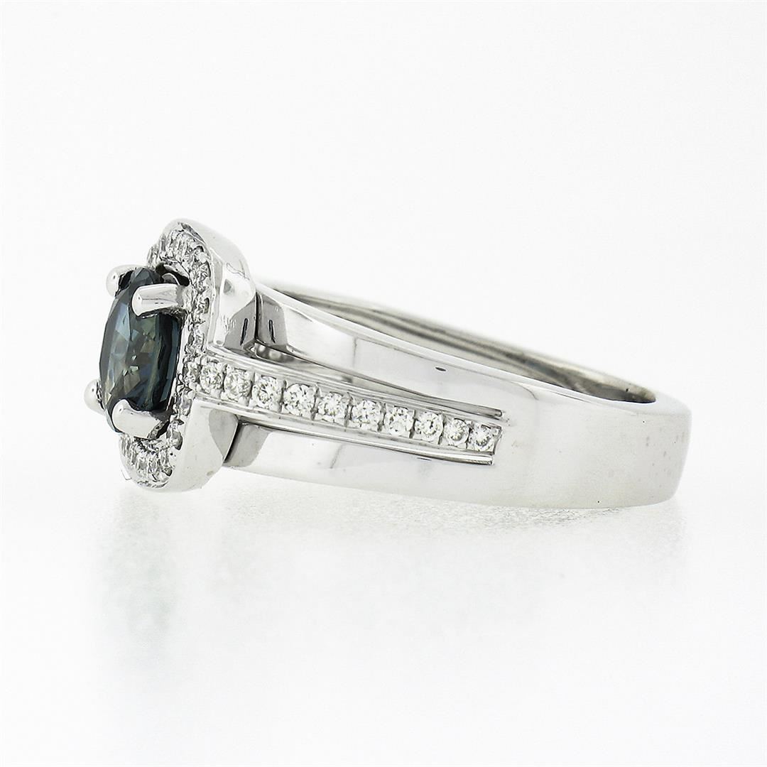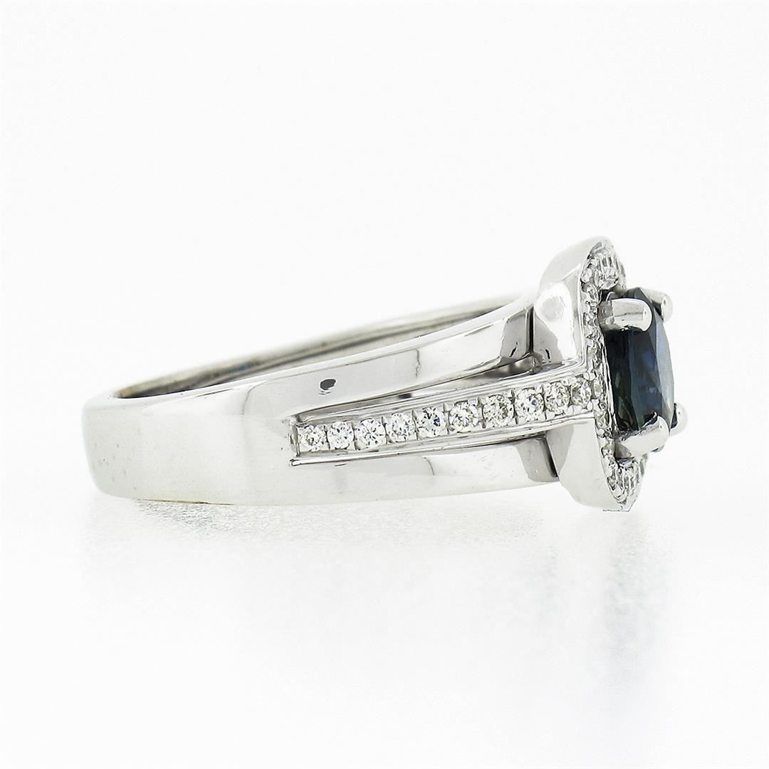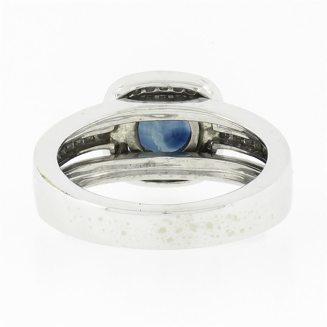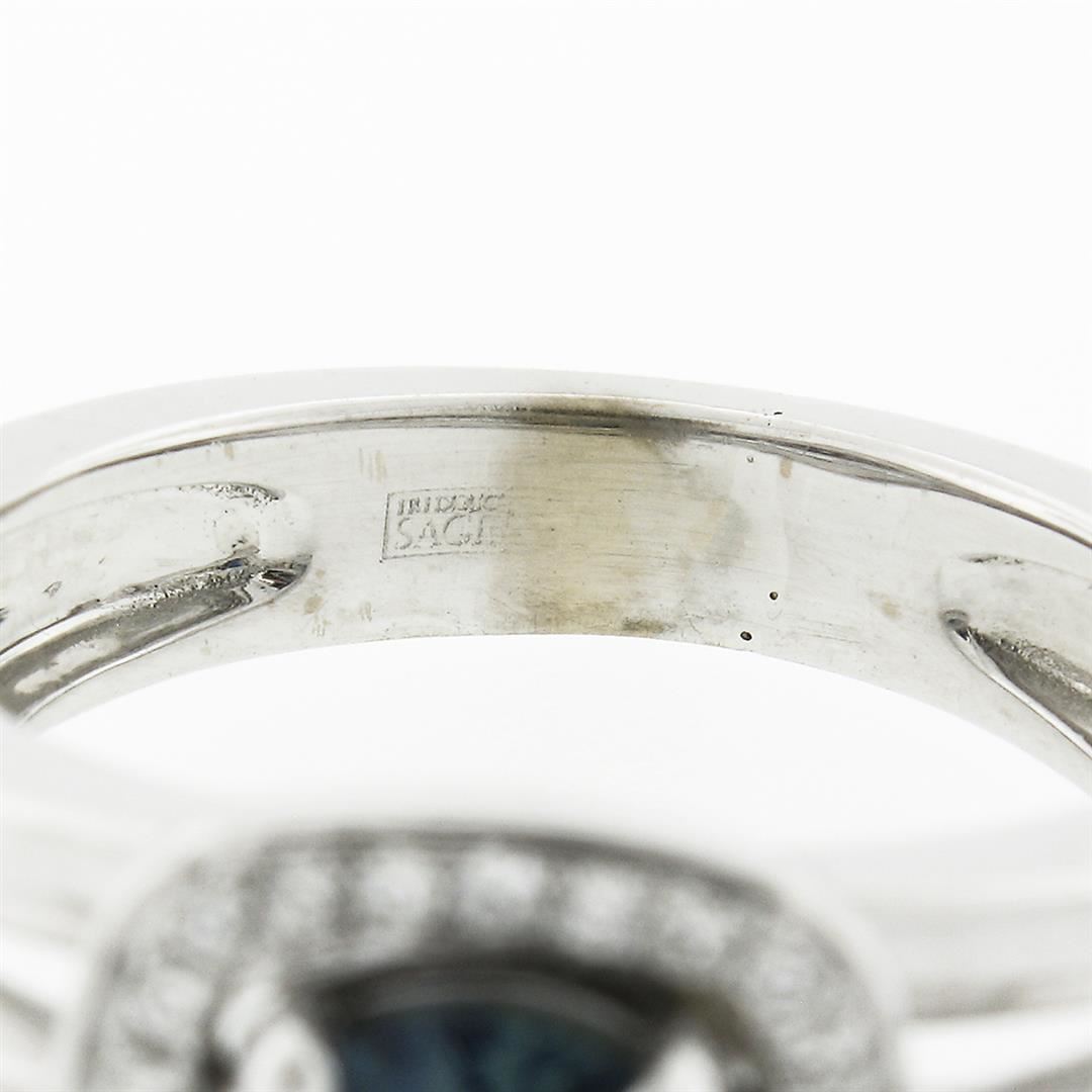 A solid 18k white gold ring by Fredric Sage, with 1 round brilliant cut natural sapphire (1.28ct), and 45 round brilliant cut natural diamonds (G/H - VS1/VS2 ; 0.45ctw). The ring is size 6.0, weighs a total of 7.82 grams, and measures 10.75mm wide.