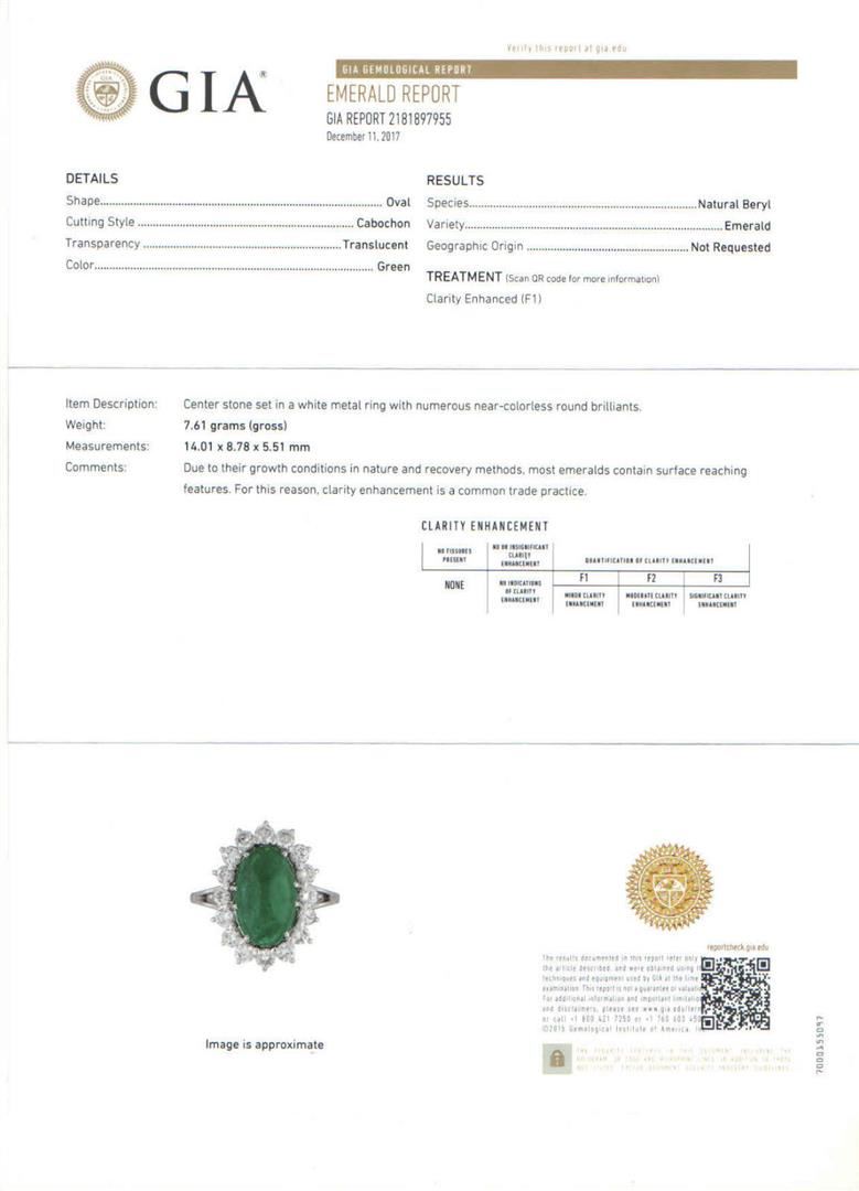 An estate solid 18k white gold and platinum cocktail ring, featuring 1 Gia certified oval cut natural emerald (5.15ct), surrounded by a halo of 16 round brilliant cut natural diamonds (F/G- VVS2/VS1; 1.06ctw). The ring is size 8.5, weighs a total of 7.61 grams, and measures 20.90mm wide. Comes with all original relevant certifications.