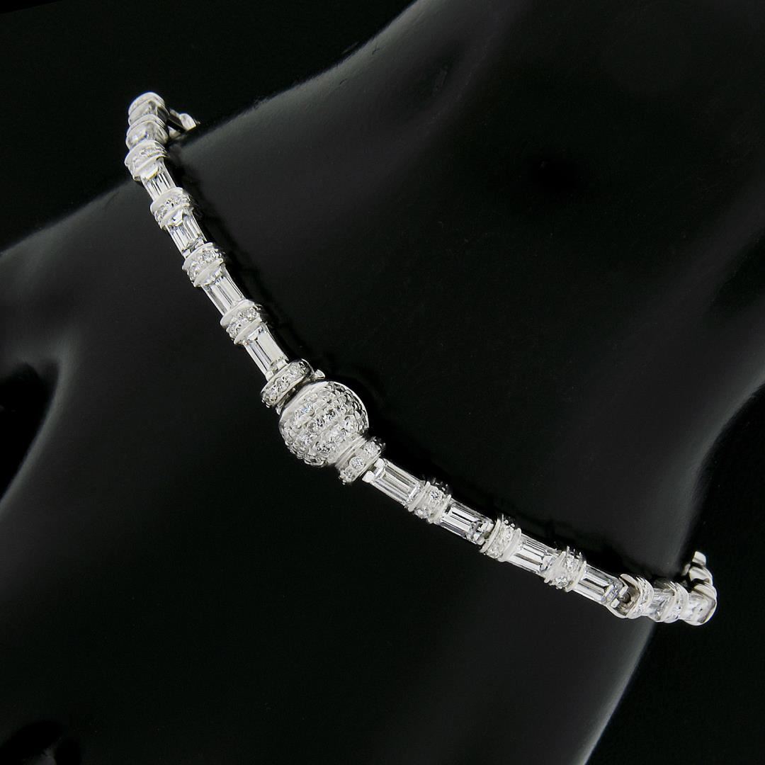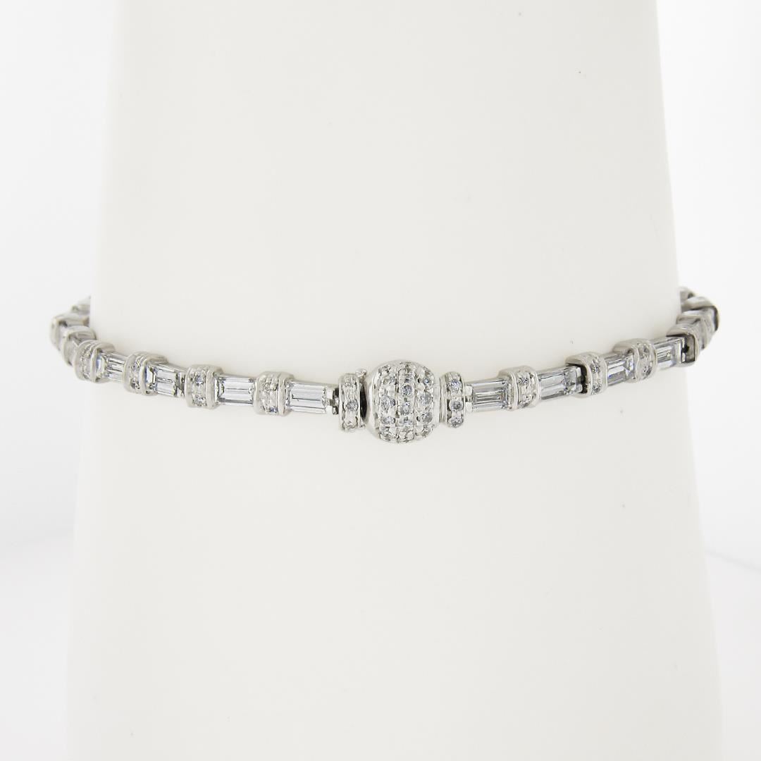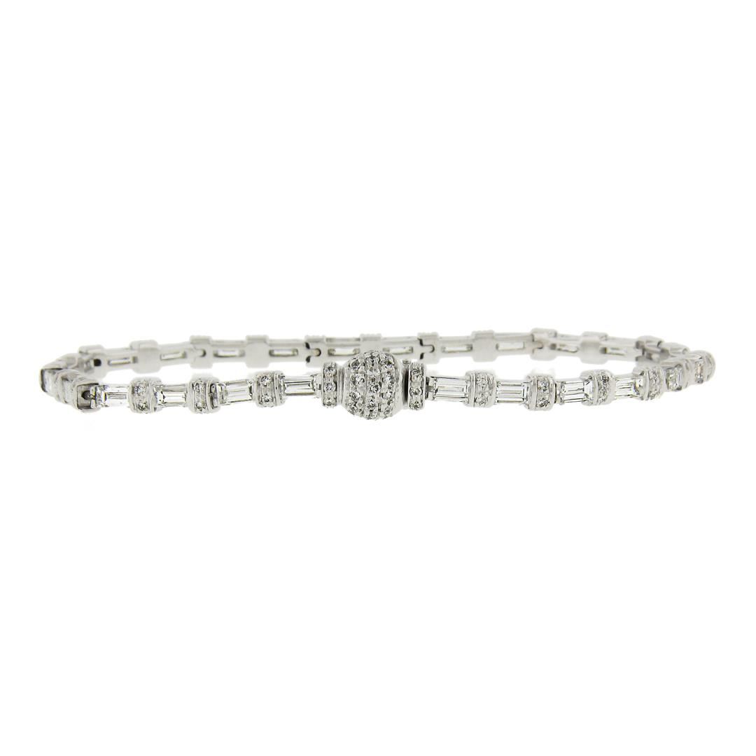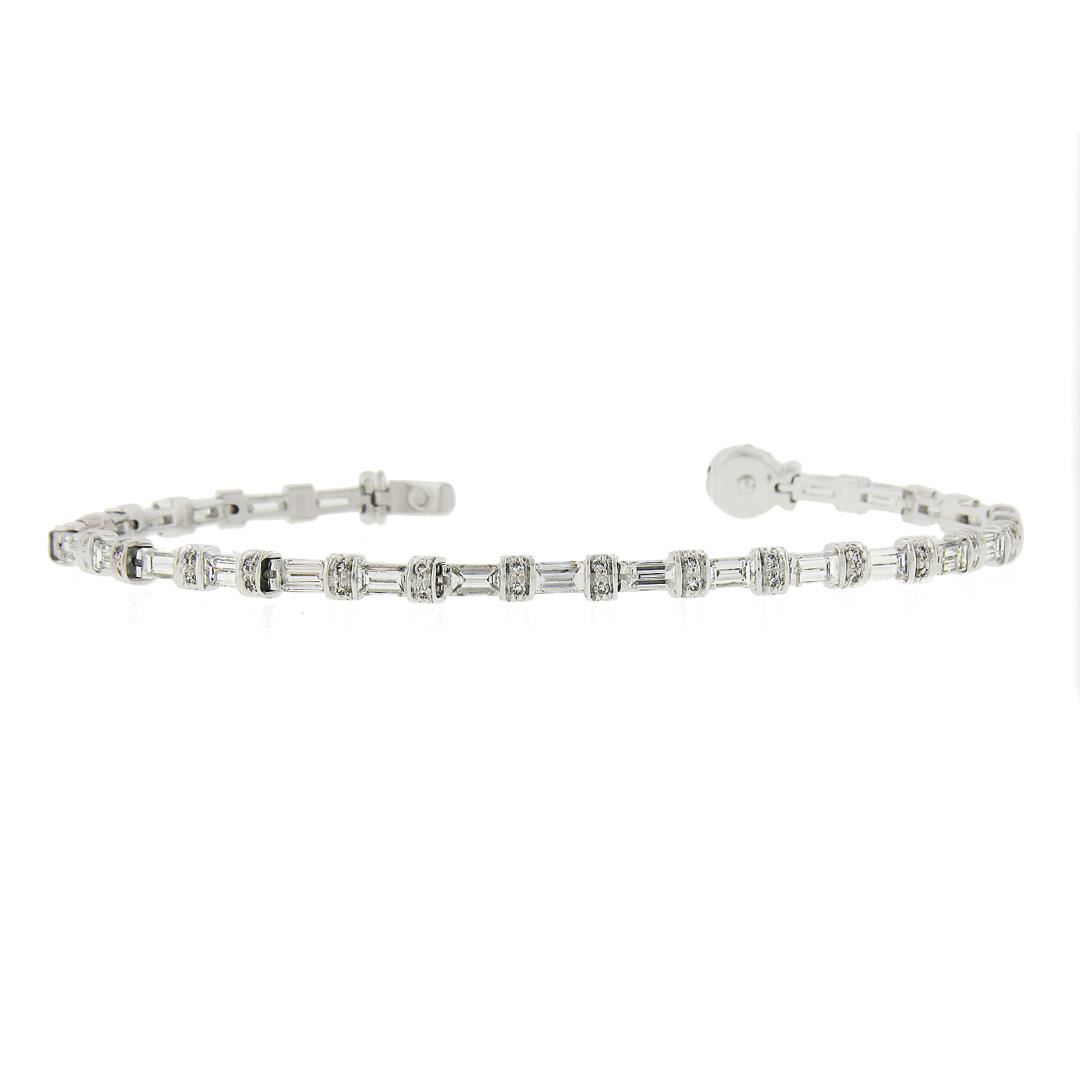 A solid 18k white gold line braceler, featuring 26 straight baguette cut natural diamonds (F/G - VVS2-VS2 ; 3.69ctw), and 75 round cut natural diamonds (G/H - VS1-SI1 ; 0.40ctw). It weighs a total of 12.42 grams, measures 7.1mm wide, and measures 7.0 inches in length.