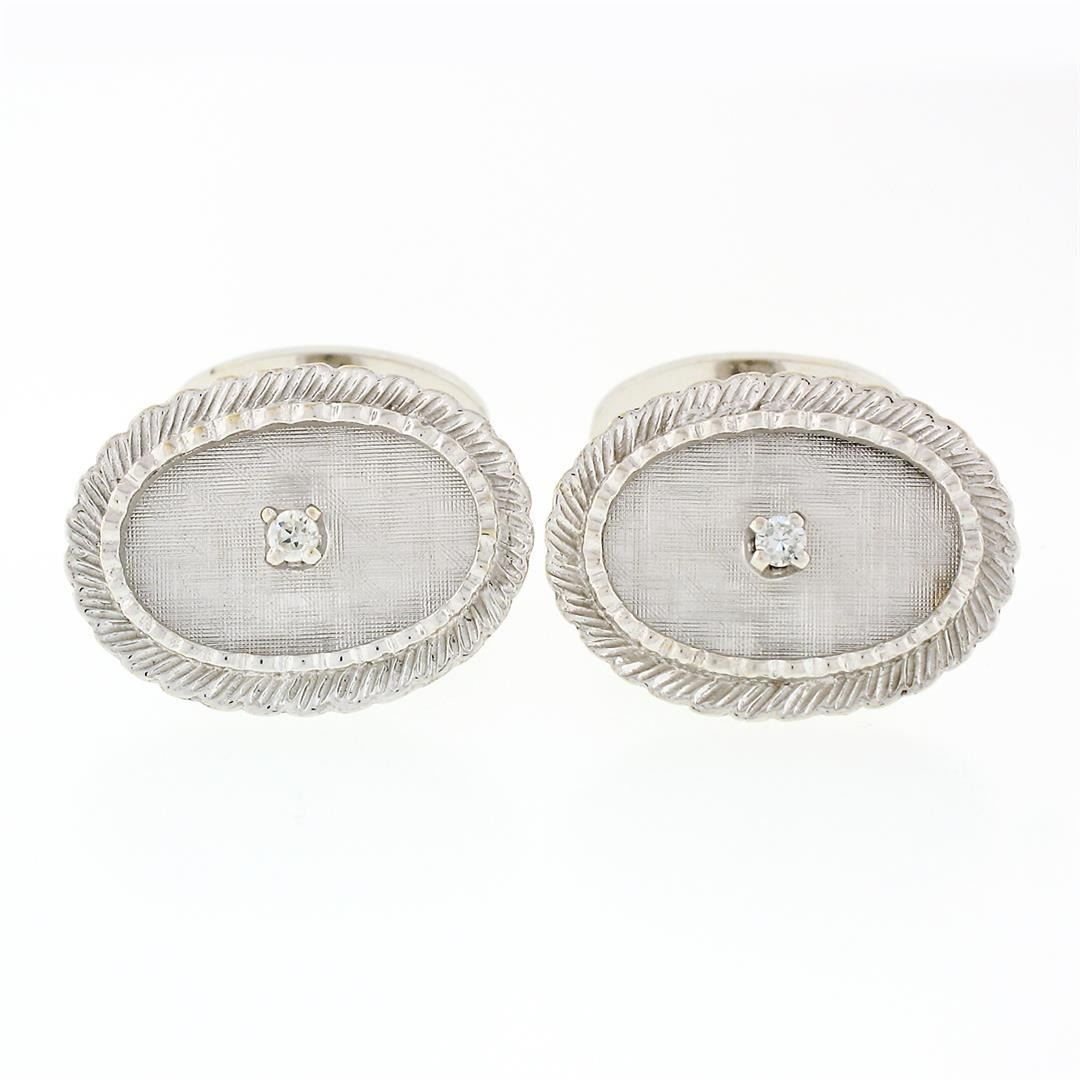 A pair of solid 18k white gold French oval cufflinks, with 2 single cut natural diamonds ( F - VS1 ; 0.06ctw). These cuff links have a Swivel design with a clearance of 12.5mm, weigh a total of 11.05 grams, and the front panels measure 18.7x13.8mm.