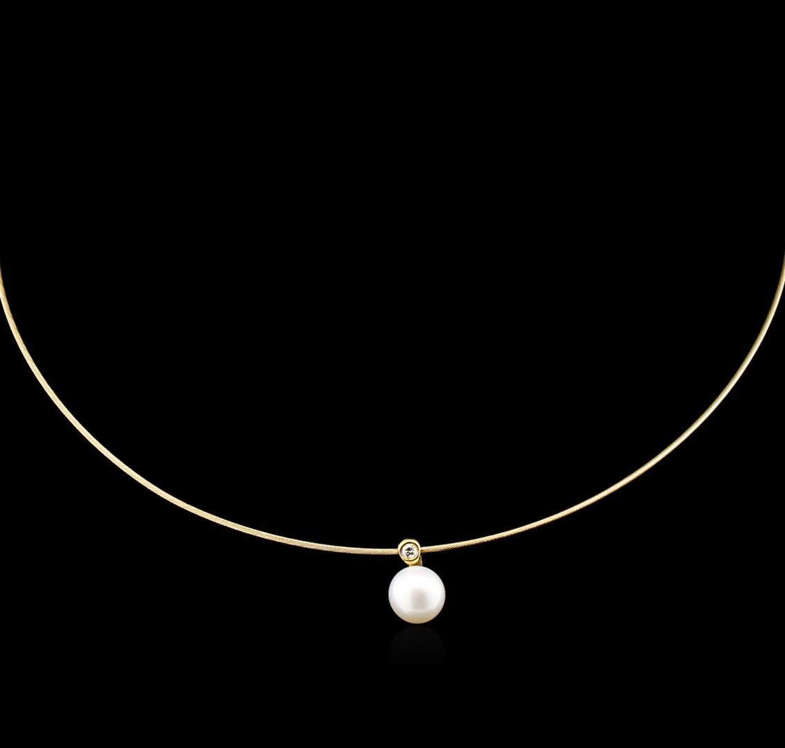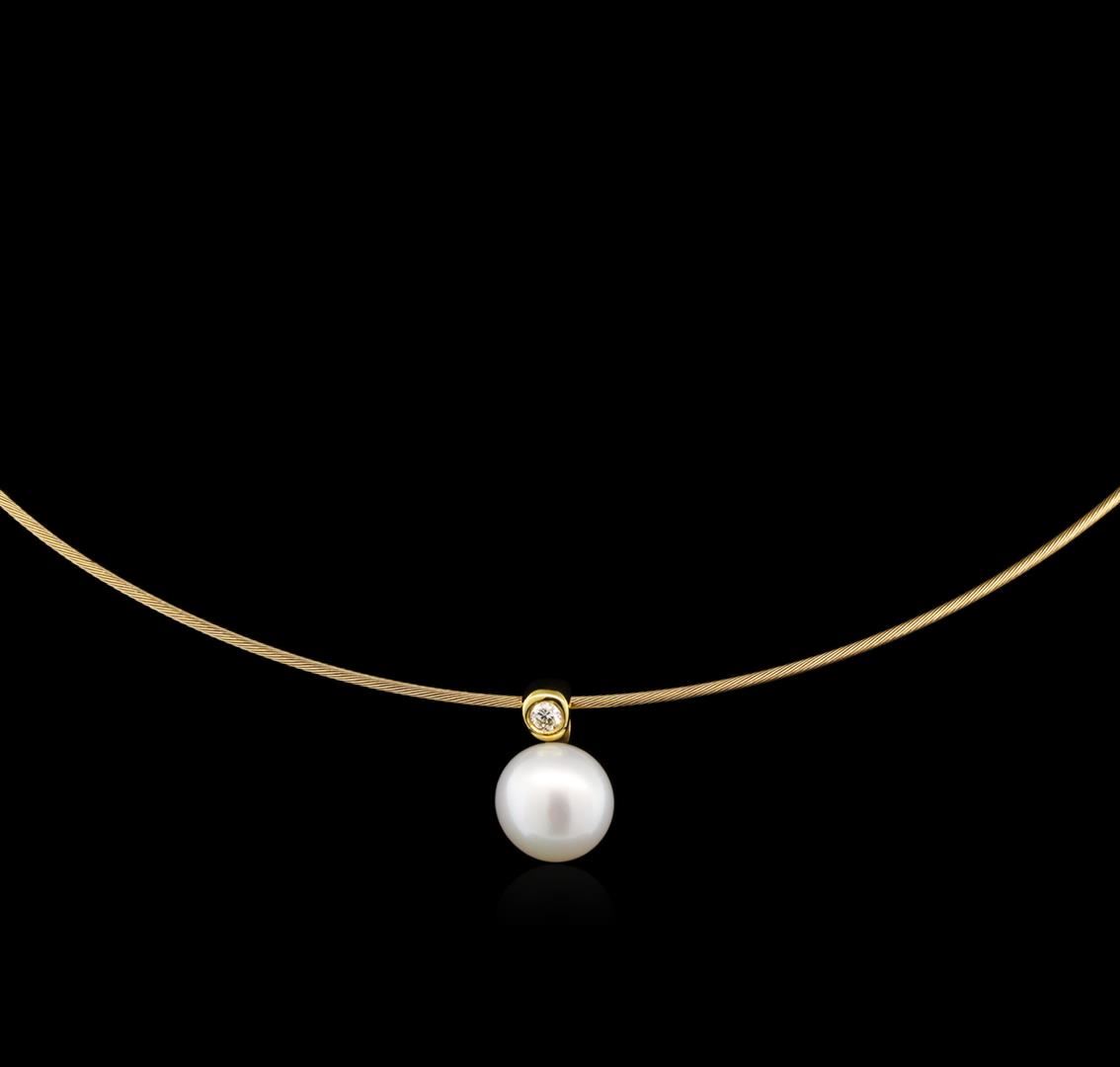 One electronically tested 14KT yellow gold lady's cast pendant & chain 16.0" long, 1.01mm twisted neckwire with a lobster claw clasp with a bright polish finish. Identified with markings of "14K". Condition is new, good workmanship. Containing: One bezel set round brilliant cut diamond, measuring 2.90 - 2.85 x 1.87mm (depth est.) approximate weight of 0.10ct. Graded in the setting. Clarity: VS-2. Color: G. Cut Very Good One Chinese freshwater pearl, 8.9mm in size to 9.0mm in size. The pearl is white in color with a good luster, button, and clean. Graded in the setting. Total Weight of Diamonds 0.10ct. Total Weight of Pendant & Chain 5.50gm. GAS Appraised at $1,385.00.