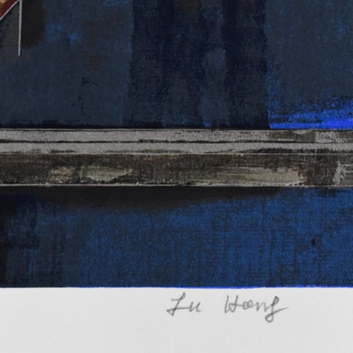 "Full Moon and Water" is a limited edition serigraph on paper by Lu Hong, numbered and hand signed by the artist. Includes Letter of Authenticity. Measures approx. 34" x 38" (with border), 29" x 29" (image).