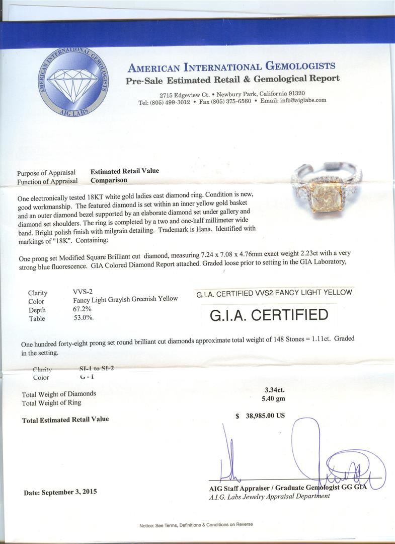 One electronically tested 18KT white gold ladies cast diamond ring. The featured diamond is set within an inner yellow gold basket and an outer diamond bezel supported by an elaborate diamond set under gallery and diamond set shoulders. The ring is completed by a two and one-half millimeter wide band. Bright polish finish with milgrain detailing. Trademark is Hana. Identified with markings of "18K". Condition is new, good workmanship. Containing: One prong set Modified Square Brilliant cut diamond, measuring 7.24 x 7.08 x 4.76mm exact weight 2.23ct with a very strong blue fluorescence. GIA Colored Diamond Report attached. Graded loose prior to setting in the GIA Laboratory, Report #1152024764. Clarity VVS-2. Color: Fancy Light Grayish Greenish Yellow. Depth: 67.2%. Table: 53.0%. One Hundred Forty-Eight prong set round brilliant cut diamonds approximate total weight of 148 Stones = 1.11ct. Graded in the setting. Clarity: SI-1 to SI-2. Color: G - I. Total Weight of Diamonds 3.34ct. Total Weight of Ring 5.40gm. AIG Appraised at $38,985.00.