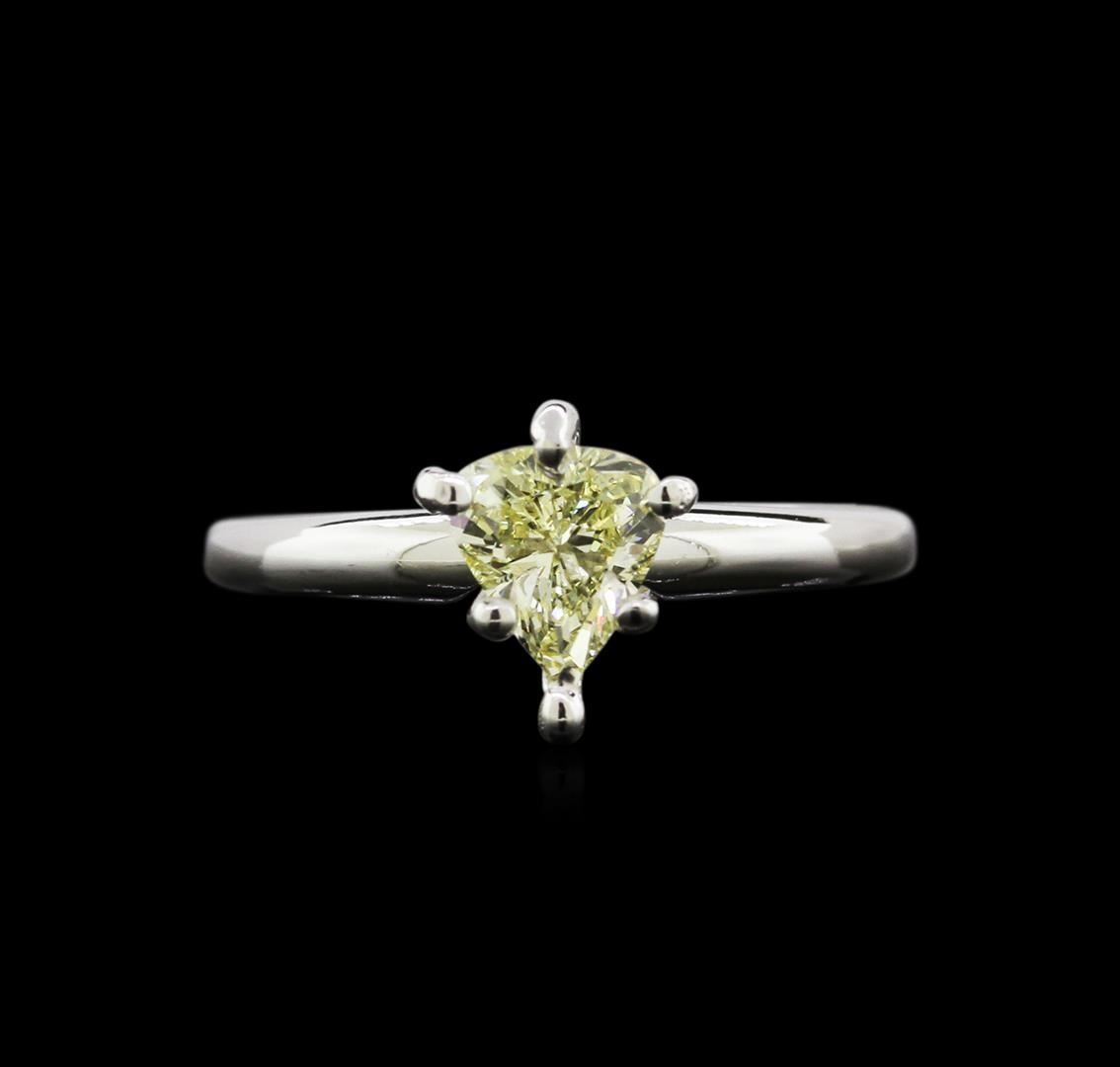 One electronically tested 14KT white gold lady's combination cast & assembled solitaire engagement ring with a bright polish finish. The featured lady's ring has a shank measuring 1.60 millimeters in width. Identified with markings of "14K". Condition is new, good workmanship. Containing: One pear shaped cut diamond, measuring 6.61 x 5.80 x 3.28mm (depth est.) approximate weight of 0.74ct. Graded loose prior to setting in the GIA Laboratory, Report #2141895629. Clarity: SI-2. Color: W - X. Total Weight of Diamonds 0.74ct. Total Weight of Ring 2.20gm. GAS Appraised.