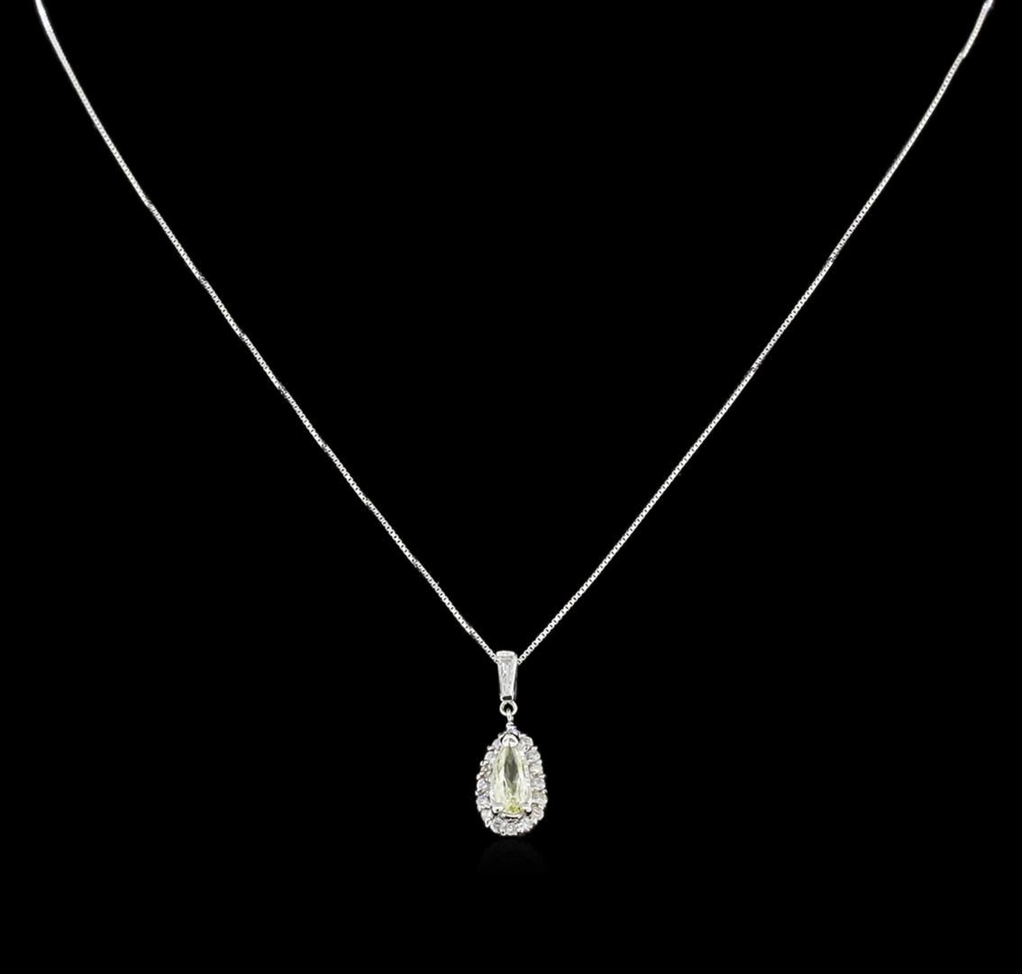 One electronically tested 14KT white gold lady's combination cast & assembled dangle pendant & chain 16.0" long, 0.70mm square box link with a spring ring clasp with a bright polish finish. Identified with markings of "14K". Condition is new, good workmanship. Containing: One prong set pear shaped cut diamond, measuring 9.10 x 3.72 x 2.34mm (depth est.) , 15.00.%. GTCF approximate weight of 0.54ct. Graded loose prior to setting in the GIA Laboratory, Report #6157180744. Clarity: SI-2 Cut Good Sixteen prong set round brilliant cut diamonds, measuring 1.70 - 1.60 x 1.07mm (depth est.) approximate total weight of 16 Stones = 0.29ct. Graded in the setting. Clarity: SI-2 to I-2. Color: H - Good One channel set baguette cut (tapered) diamond, measuring 4.70 x 1.50 x 1.28mm (depth est.) approximate weight of 0.08ct. Graded in the setting. Clarity: SI-1. Color: Good. Total Weight of Diamonds 0.91ct. Total Weight of Pendant & Chain 2.60gm. GAS Appraised at $5,940.00.