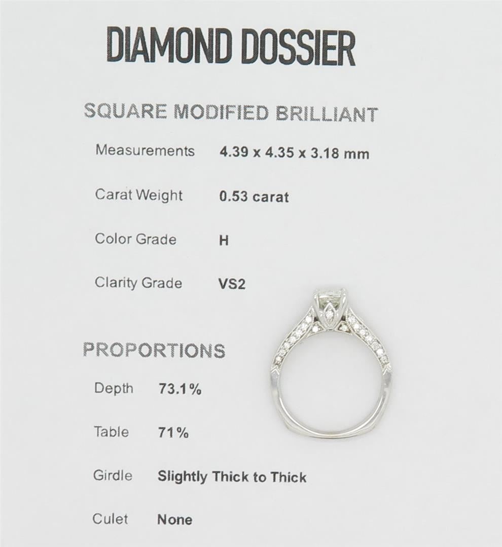 One tested 14K white gold diamond ring. Containing: One GIA Certified Princess Cut Diamond. Size: .53CT, Clarity: VS2, Color: H. Approximate total diamond weight: .93CTW. All diamonds are graded in the mounting unless otherwise stated. Weight of ring: 3.9 grams, Size: 5.5. GIA Appraised.