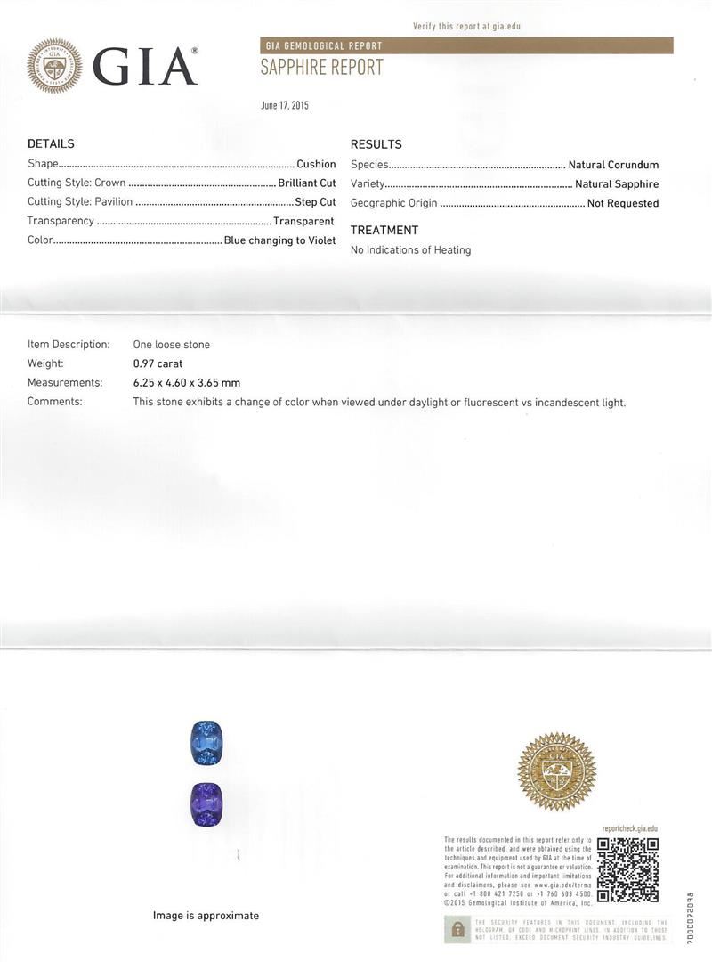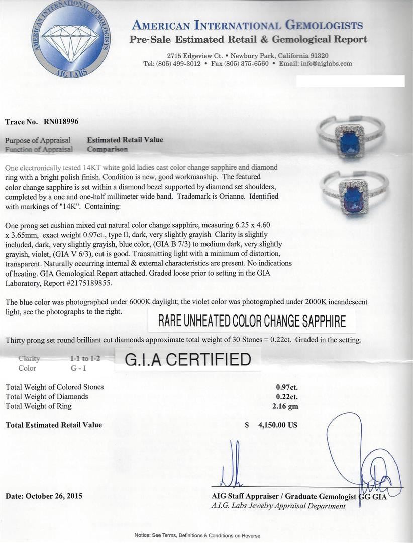 One electronically tested 14KT white gold ladies cast color change sapphire and diamond ring with a bright polish finish. The featured color change sapphire is set within a diamond bezel supported by diamond set shoulders, completed by a one and one-half millimeter wide band. Trademark is Orianne. Identified with markings of "14K". Condition is new, good workmanship. Containing: One prong set cushion mixed cut natural color change sapphire, measuring 6.25 x 4.60 x 3.65mm, exact weight 0.97ct., type II, dark, very slightly grayish Clarity is slightly included, dark, very slightly grayish, blue color, (GIA B 7/3) to medium dark, very slightly grayish, violet, (GIA V 6/3), cut is good. Transmitting light with a minimum of distortion, transparent. Naturally occurring internal & external characteristics are present. No indications of heating. GIA Gemological Report attached. Graded loose prior to setting in the GIA Laboratory, Report #2175189855.The blue color was photographed under 6000K daylight; the violet color was photographed under 2000K incandescent light, see the photographs to the right. Thirty prong set round brilliant cut diamonds approximate total weight of 30 Stones = 0.22ct. Graded in the setting. Clarity: I-1 to I-2. Color: G - I. Total Weight of Colored Stones 0.97ct. Total Weight of Diamonds 0.22ct. Total Weight of Ring 2.16gm. AIG Appraised at $4,150.00.