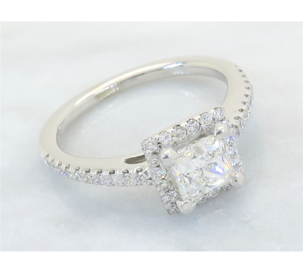 One tested 14K white gold diamond ring. Containing: One GIA Certified Princess Cut Diamond. Size: .73CT, Clarity: VVS2, Color: G. 40 Round Brilliant Cut Diamonds. Approximate total diamond weight: 1.03CTW. All diamonds are graded in the mounting unless otherwise stated. Weight of ring: 3.3 grams, Size: 5.75.