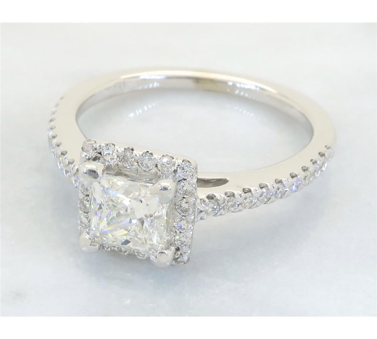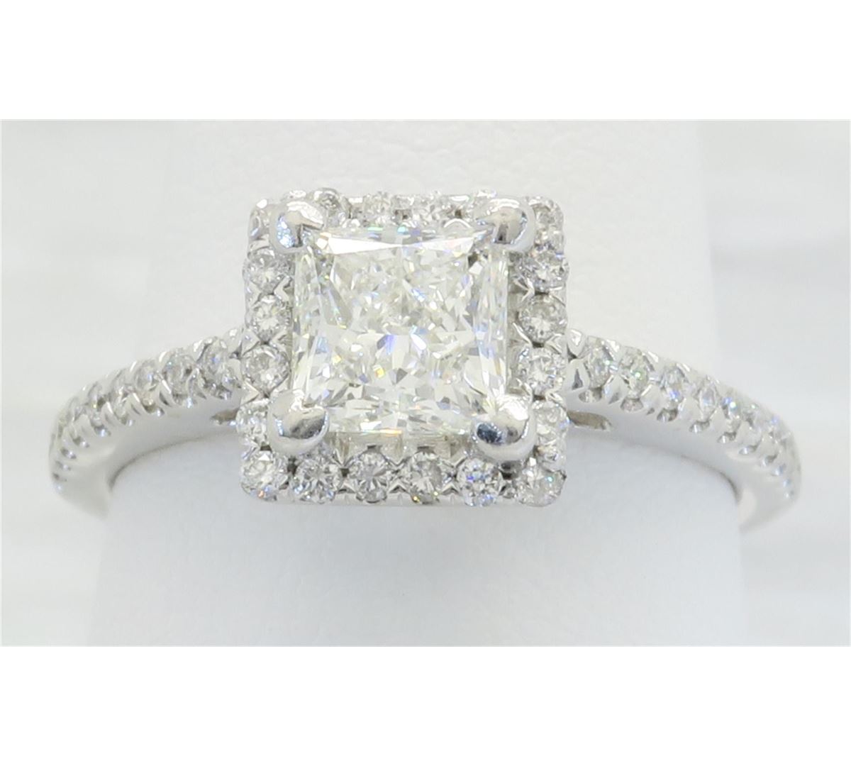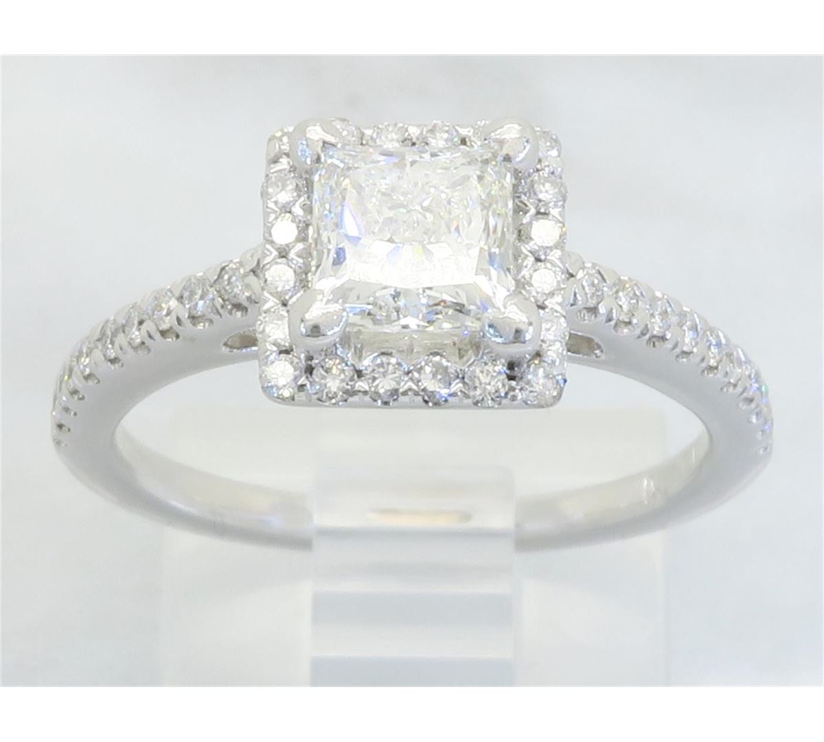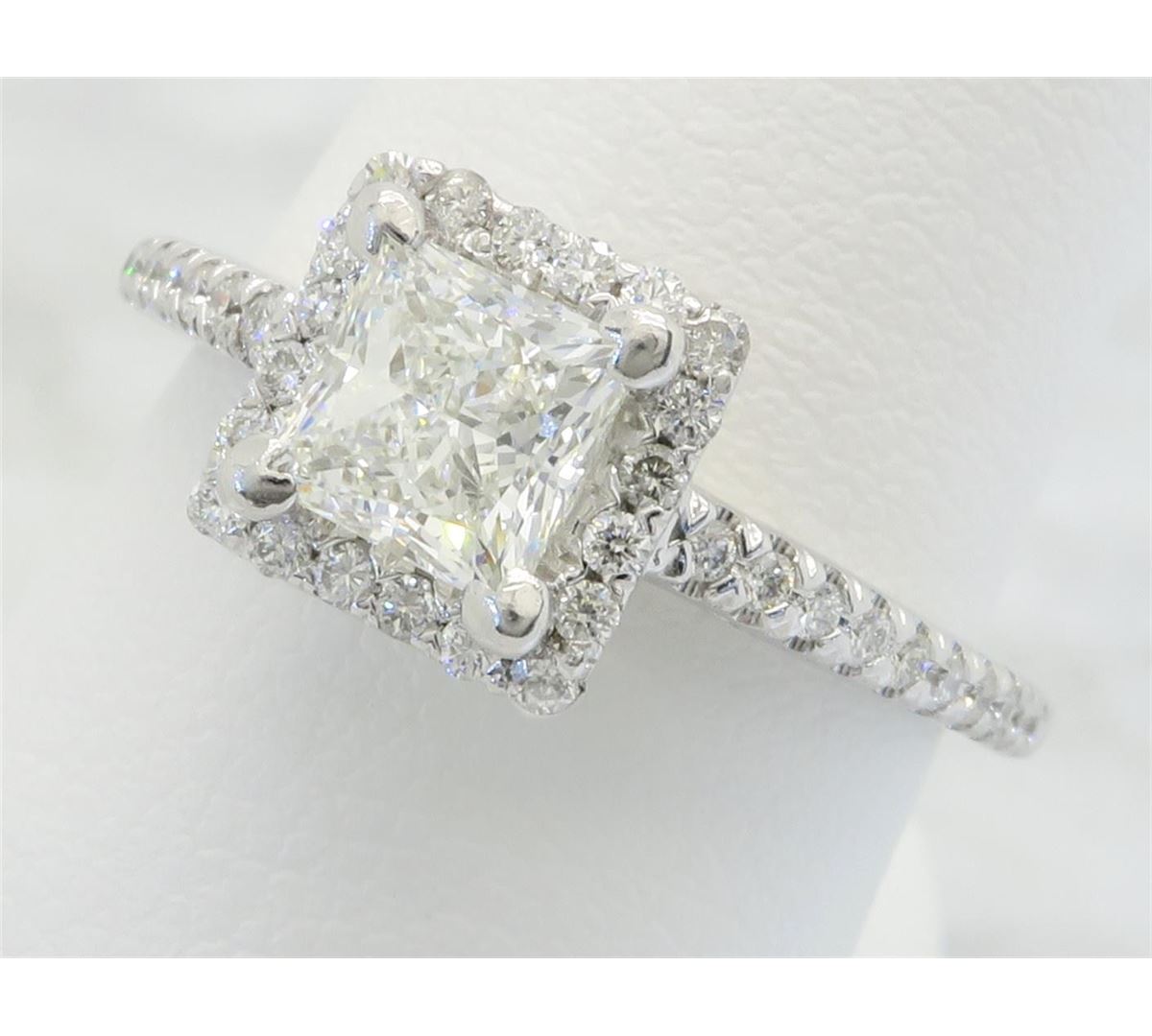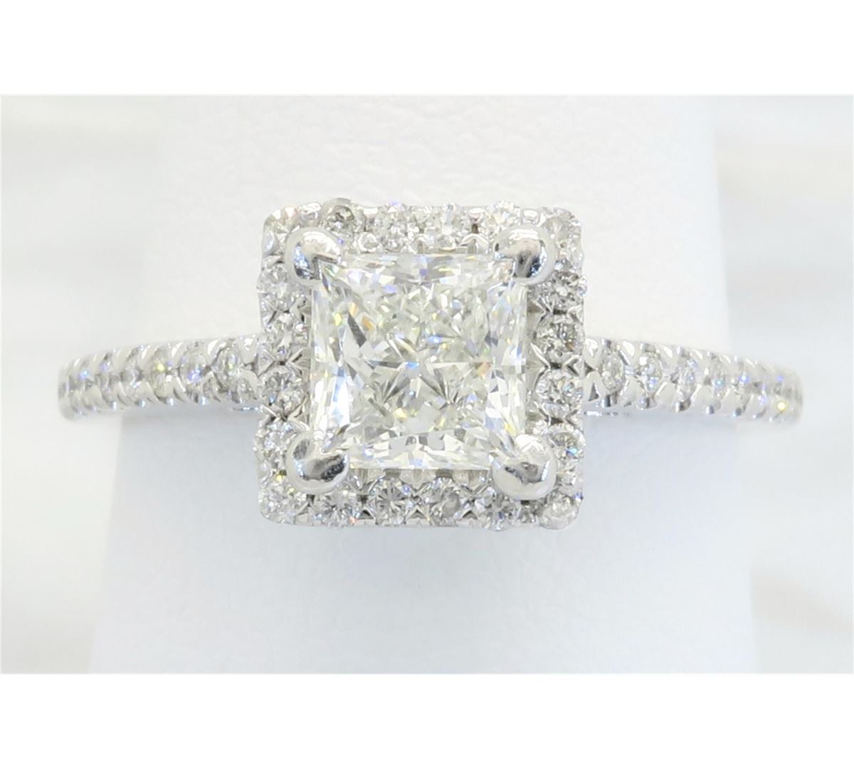 One tested 14K white gold diamond ring. Containing: One GIA Certified Princess Cut Diamond. Size: .73CT, Clarity: VVS2, Color: G. 40 Round Brilliant Cut Diamonds. Approximate total diamond weight: 1.03CTW. All diamonds are graded in the mounting unless otherwise stated. Weight of ring: 3.3 grams, Size: 5.75.