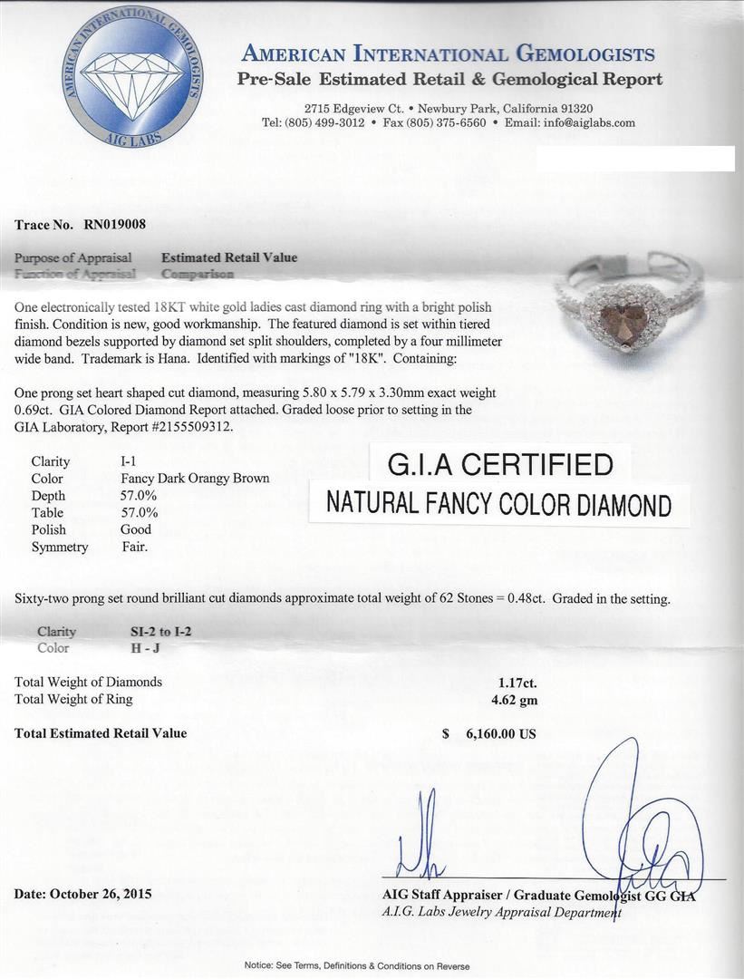 One electronically tested 18KT white gold ladies cast diamond ring with a bright polish finish. The featured diamond is set within tiered diamond bezels supported by diamond set split shoulders, completed by a four millimeter wide band. Trademark is Hana. Identified with markings of "18K". Condition is new, good workmanship. Containing: One prong set heart shaped cut diamond, measuring 5.80 x 5.79 x 3.30mm exact weight 0.69ct. GIA Colored Diamond Report attached. Graded loose prior to setting in the GIA Laboratory, Report #2155509312. Clarity I-1. Color: Fancy Dark Orangy Brown. Depth: 57.0%. Table: 57.0%. Polish Good Symmetry Fair. Sixty-Two prong set round brilliant cut diamonds approximate total weight of 62 Stones = 0.48ct. Graded in the setting. Clarity: SI-2 to I-2. Color: H - J. Total Weight of Diamonds 1.17ct. Total Weight of Ring 4.62gm. AIG Appraised at $6,160.00.