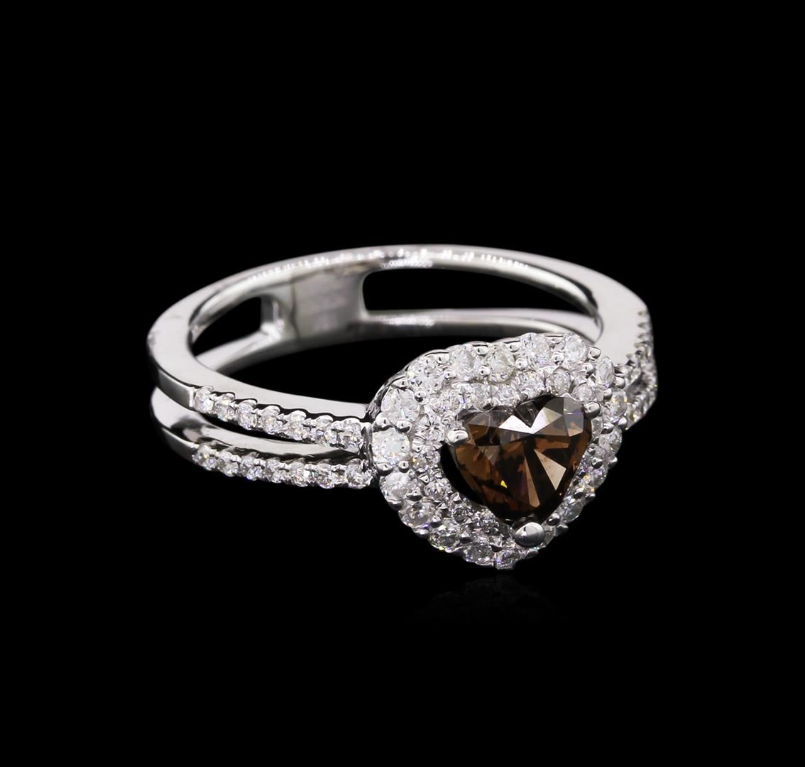 One electronically tested 18KT white gold ladies cast diamond ring with a bright polish finish. The featured diamond is set within tiered diamond bezels supported by diamond set split shoulders, completed by a four millimeter wide band. Trademark is Hana. Identified with markings of "18K". Condition is new, good workmanship. Containing: One prong set heart shaped cut diamond, measuring 5.80 x 5.79 x 3.30mm exact weight 0.69ct. GIA Colored Diamond Report attached. Graded loose prior to setting in the GIA Laboratory, Report #2155509312. Clarity I-1. Color: Fancy Dark Orangy Brown. Depth: 57.0%. Table: 57.0%. Polish Good Symmetry Fair. Sixty-Two prong set round brilliant cut diamonds approximate total weight of 62 Stones = 0.48ct. Graded in the setting. Clarity: SI-2 to I-2. Color: H - J. Total Weight of Diamonds 1.17ct. Total Weight of Ring 4.62gm. AIG Appraised at $6,160.00.
