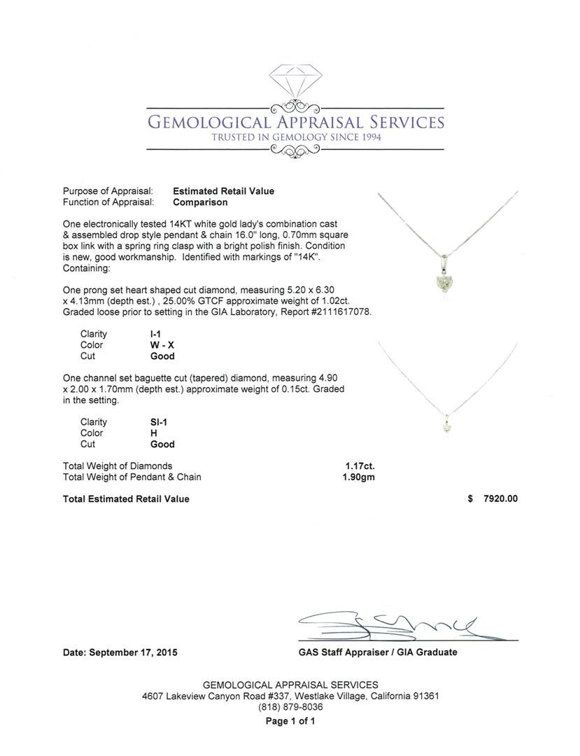 One electronically tested 14KT white gold lady's combination cast & assembled drop style pendant & chain 16.0" long, 0.70mm square box link with a spring ring clasp with a bright polish finish. Identified with markings of "14K". Condition is new, good workmanship. Containing: One prong set heart shaped cut diamond, measuring 5.20 x 6.30 x 4.13mm (depth est.) , 25.00.%. GTCF approximate weight of 1.02ct. Graded loose prior to setting in the GIA Laboratory, Report #2111617078. Clarity: I-1. Color: W - X. Cut Good One channel set baguette cut (tapered) diamond, measuring 4.90 x 2.00 x 1.70mm (depth est.) approximate weight of 0.15ct. Graded in the setting. Clarity: SI-1. Color: Good. Total Weight of Diamonds 1.17ct. Total Weight of Pendant & Chain 1.90gm. GAS Appraised at $7,920.00.