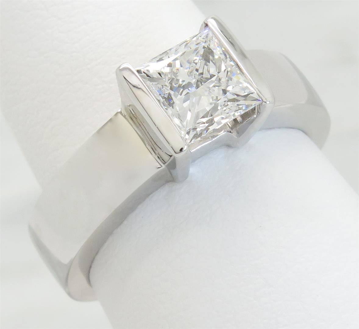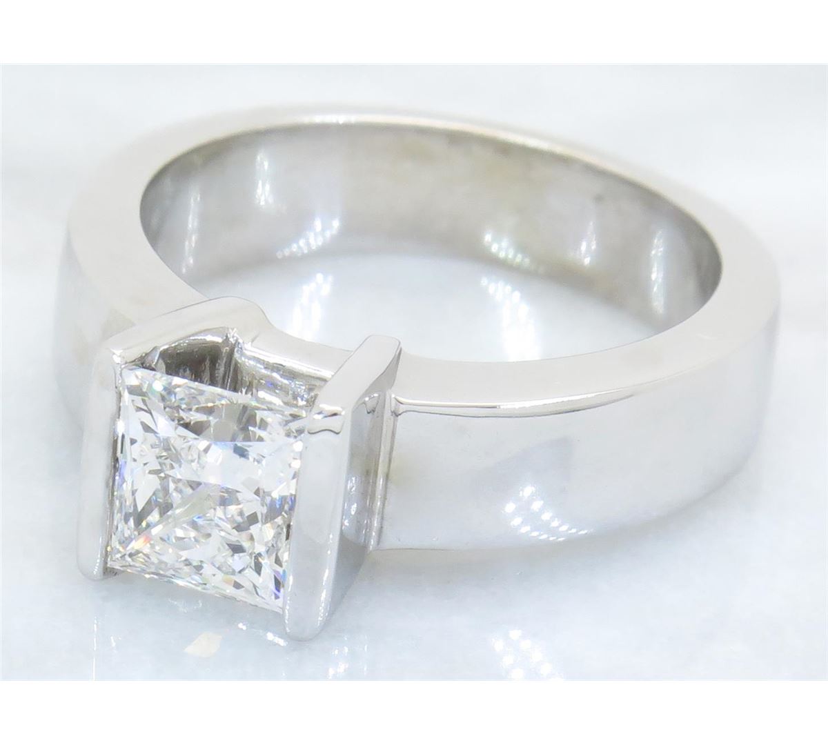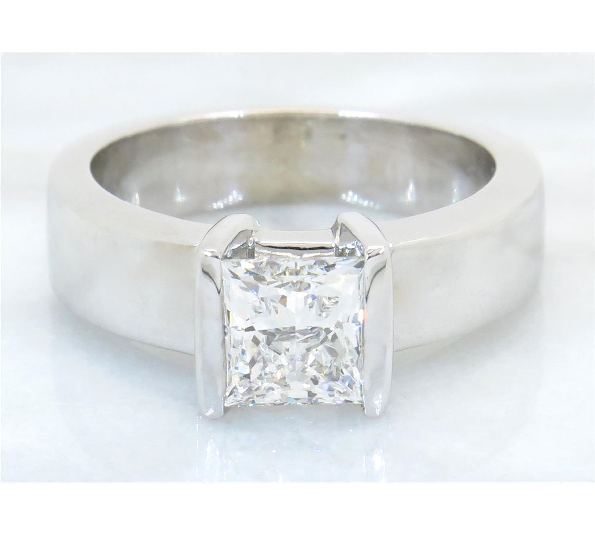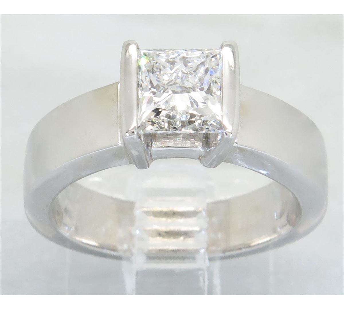 One tested 14K white gold diamond ring. Containing: One GIA Certified Princess Cut Diamond. Size: 1.29CT, Clarity: VS1, Color: D. All diamonds are graded in the mounting unless otherwise stated. Weight of ring: 7.9 grams, Size: 5.5. GIA Appraised.