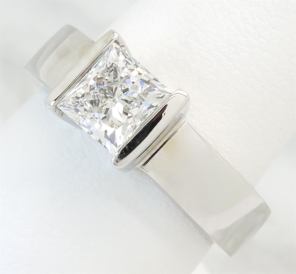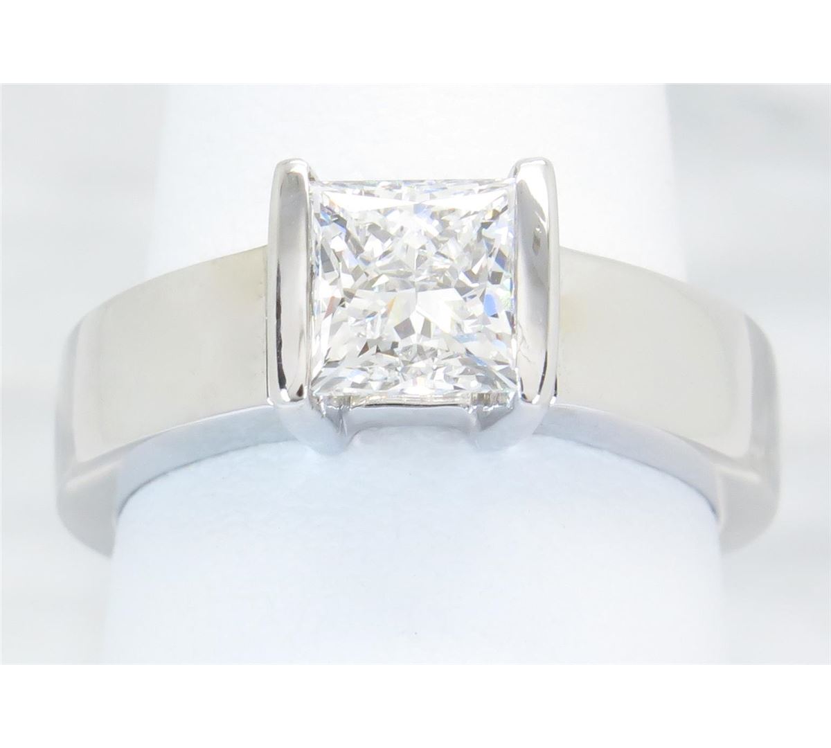 One tested 14K white gold diamond ring. Containing: One GIA Certified Princess Cut Diamond. Size: 1.29CT, Clarity: VS1, Color: D. All diamonds are graded in the mounting unless otherwise stated. Weight of ring: 7.9 grams, Size: 5.5. GIA Appraised.