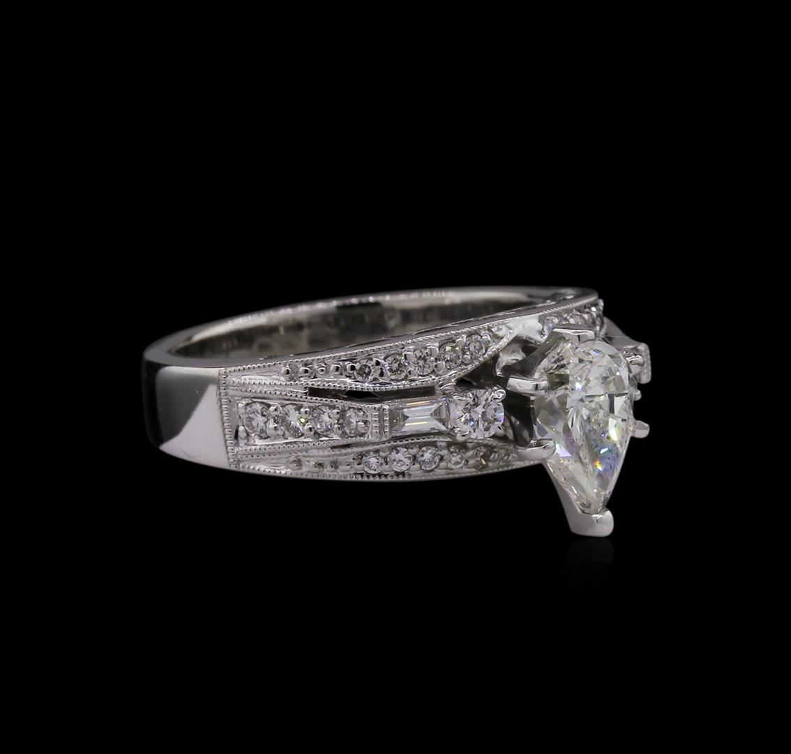 One electronically tested 18KT white gold ladies cast diamond unity ring. The featured diamond is supported by elaborate diamond set raised shoulders and mirroring diamond ribbons, completed by a three and one-half millimeter wide band. Bright polish finish with milgrain detailing. Identified with markings of "18K 750". Condition is new, good workmanship. Containing: One prong set pear shaped cut diamond, measuring 8.09 x 5.39 x 3.82mm exact weight 1.02ct with a very strong blue fluorescence. GIA Diamond Grading Report attached. Graded loose prior to setting in the GIA Laboratory, Report #2131111448. Clarity: SI-2. Color: H. Depth 70.9%. Table 65.0%. Two prong set round brilliant cut diamonds, measuring 2.20 - 2.20 x 1.32mm (depth est.) approximate total weight of 2 Stones = 0.08ct. Graded in the setting. Clarity: I-1. Color: G Twenty-Eight prong set round brilliant cut diamonds, measuring 1.70 - 1.00 x 0.81mm (depth est.) approximate total weight of 28 Stones = 0.26ct. Graded in the setting. Clarity: SI-1 to I-1. Color: G - I Two channel set baguette cut diamonds, measuring 2.70 x 1.40 x 0.98mm (depth est.) approximate total weight of 2 Stones = 0.06ct. Graded in the setting. Clarity: VS-2. Color: G. Total Weight of Diamonds 1.42ct. Total Weight of Ring 7.68gm. AIG Appraised at $15,435.00.