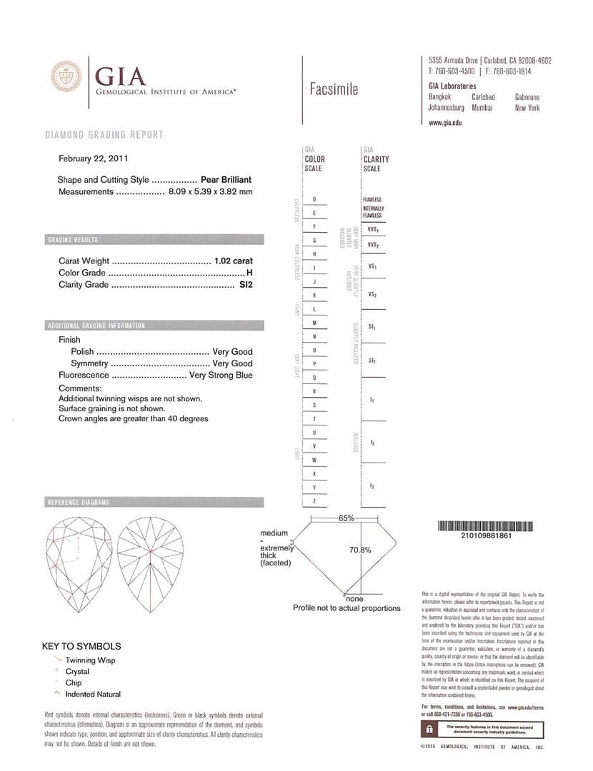 One electronically tested 18KT white gold ladies cast diamond unity ring. The featured diamond is supported by elaborate diamond set raised shoulders and mirroring diamond ribbons, completed by a three and one-half millimeter wide band. Bright polish finish with milgrain detailing. Identified with markings of "18K 750". Condition is new, good workmanship. Containing: One prong set pear shaped cut diamond, measuring 8.09 x 5.39 x 3.82mm exact weight 1.02ct with a very strong blue fluorescence. GIA Diamond Grading Report attached. Graded loose prior to setting in the GIA Laboratory, Report #2131111448. Clarity: SI-2. Color: H. Depth 70.9%. Table 65.0%. Two prong set round brilliant cut diamonds, measuring 2.20 - 2.20 x 1.32mm (depth est.) approximate total weight of 2 Stones = 0.08ct. Graded in the setting. Clarity: I-1. Color: G Twenty-Eight prong set round brilliant cut diamonds, measuring 1.70 - 1.00 x 0.81mm (depth est.) approximate total weight of 28 Stones = 0.26ct. Graded in the setting. Clarity: SI-1 to I-1. Color: G - I Two channel set baguette cut diamonds, measuring 2.70 x 1.40 x 0.98mm (depth est.) approximate total weight of 2 Stones = 0.06ct. Graded in the setting. Clarity: VS-2. Color: G. Total Weight of Diamonds 1.42ct. Total Weight of Ring 7.68gm. AIG Appraised at $15,435.00.