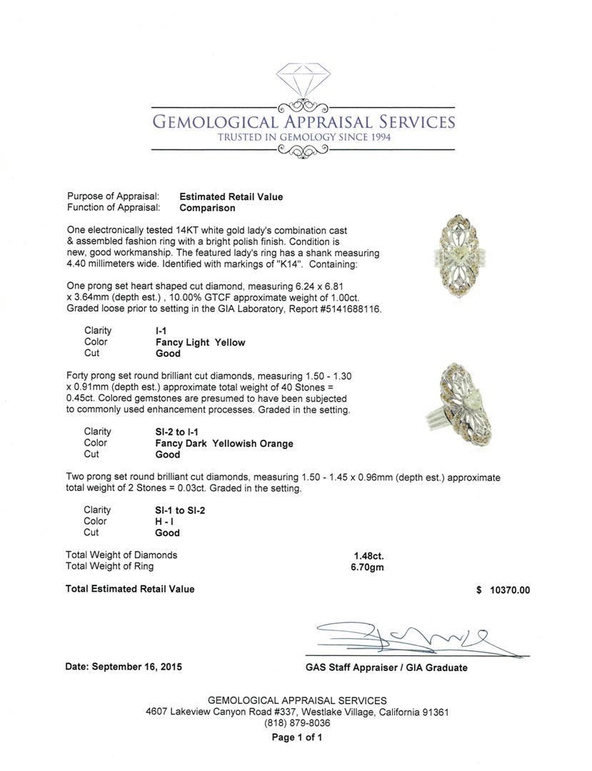 One electronically tested 14KT white gold lady's combination cast & assembled fashion ring with a bright polish finish. The featured lady's ring has a shank measuring 4.40 millimeters wide. Identified with markings of "K14". Condition is new, good workmanship. Containing: One prong set heart shaped cut diamond, measuring 6.24 x 6.81 x 3.64mm (depth est.) , 10.00.%. GTCF approximate weight of 1.00ct. Graded loose prior to setting in the GIA Laboratory, Report #5141688116. Clarity: I-1 Cut Good Forty prong set round brilliant cut diamonds, measuring 1.50 - 1.30 x 0.91mm (depth est.) approximate total weight of 40 Stones = 0.45ct. Colored gemstones are presumed to have been subjected to commonly used enhancement processes. Graded in the setting. Clarity: SI-2 to I-1 Cut Good Two prong set round brilliant cut diamonds, measuring 1.50 - 1.45 x 0.96mm (depth est.) approximate total weight of 2 Stones = 0.03ct. Graded in the setting. Clarity: SI-1 to SI-2. Color: H - I. Cut Good. Total Weight of Diamonds 1.48ct. Total Weight of Ring 6.70gm. GAS Appraised.