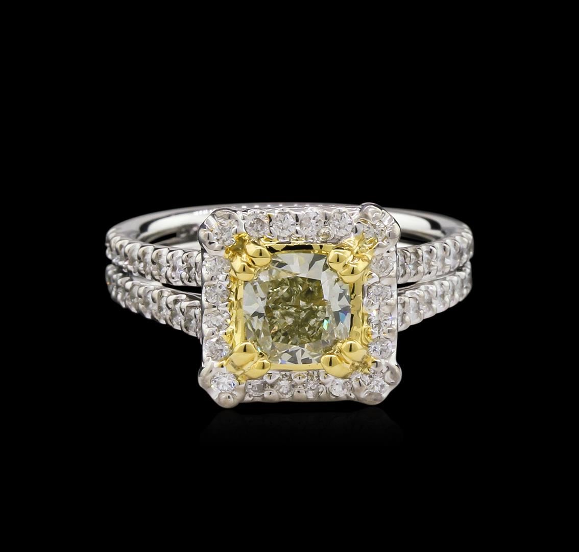 One electronically tested 14KT white and yellow gold lady's combination cast & assembled wedding ring with a split shank halo with a bright polish finish. The featured lady's ring has a double shank measuring 3.51 millimeters wide. Identified with markings of "14K". Condition is new, good workmanship. Containing: One prong set cushion cut diamond, measuring 5.74 x 5.53 x 3.74mm (depth est.) , 5.00% GTCF approximate weight of 1.01ct. GIA Gem Trade Laboratory Report # 5166712763. Clarity: SI-1. Color: W - X. Cut: Very Good. Sixty prong set round brilliant cut diamonds, measuring 1.35 - 1.25 x 0.81mm (depth est.) approximate total weight of 60 Stones = 0.50ct. Graded in the setting. Clarity: SI-1 to I-1. Color: G - I. Cut: Good. Total Weight of Diamonds 1.51ct. Total Weight of Ring 6.00gm. GAS Appraised at $8,100.00.